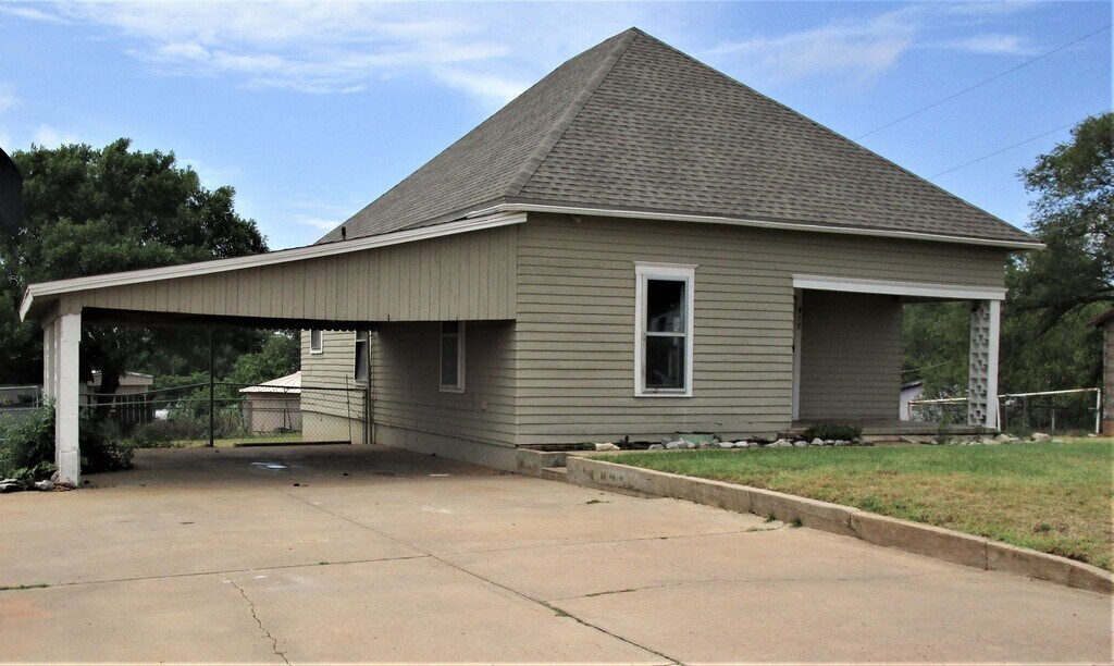 This 2 bedroom one bath home in Hydro is packed with charm and updates. It has central heat and air, original wood trim and doors, recent exterior paint and new interior paint throughout. Wood look luxury vinyl flooring just installed in living room and both bedrooms. The kitchen has painted white cabinets, electric stove and refrigerator and a walk in pantry. The laundry room in back has plenty of space for additional storage. There is a covered front porch, carport and chain link fenced backyard. Tenants are responsible for maintaining the yard and flower bed.