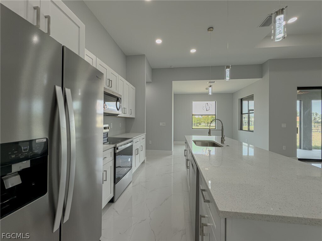 Welcome to this beautifully designed brand-new construction in prime Lehigh Acres. This 3-bedroom + den home offers 1,717 sqft of living space on an oversized lot,blending comfort and modern style. The open-concept kitchen features stainless steel appliances,flowing into spacious living areas with elegant porcelain floors. The master suite includes two walk-in closets,a luxurious bathroom with dual showers,and a bathtub. Two additional bedrooms and a den offer privacy and flexibility. A metal roof adds durability and style. Enjoy a 2-car garage and a screened lanai with a full outdoor kitchen perfect for entertaining. A key highlight is the canal-front backyard,offering privacy and Space. Disclosure: Some photos have been virtually staged to illustrate potential.