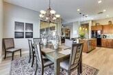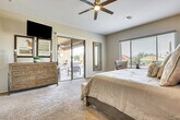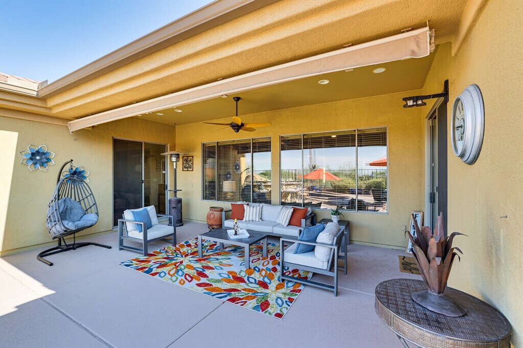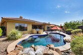 Feel at home in 'Anthem Oasis,' a 3-bedroom, 2.5-bath vacation rental situated on the 10th hole of the Persimmon Golf Course, boasting panoramic mountain views and wide-open spaces. This home features high-end modern furnishings with a sectional sofa, a fireplace, and a 65-inch flat-screen Smart TV. The fully equipped kitchen includes cooking basics, granite countertops, a breakfast bar, a Keurig coffee maker, a tea kettle, and a Crock-Pot. You'll also find linens, towels, complimentary toiletries, trash bags, paper towels, a washer/dryer, central heating and A/C, and beach towels, chairs, and an umbrella. Garage parking for one vehicle and driveway parking for two vehicles are available. Bring the family to this Anthem home for a luxury desert retreat, surrounded by golf course views and Southwest scenes from surrounding trails. You'll love spending the days in the backyard featuring a patio with a gas grill, a dry bar, a private pool, a brand new hot tub, and an outdoor kiva fireplace with a covered patio and sectional lounge chair. Whether you choose to golf at Dove Valley, shop at the Outlets at Anthem, or go on a scenic hike, this home will be waiting for your return. Step-free access. Smoking, pets, events, parties, and large gatherings are not allowed. There is a $225 cap for electricity and $125 cap for water on a monthly basis and any amount above these caps will be charged to the guest as a post stay charge. Do not take glass to the backyard, patio, or pool. A photo ID may be required upon check-in. Street parking and RV parking on the property are prohibited. [SI]