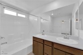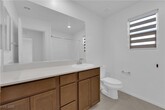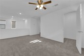 Discover modern luxury in this newly built 2024 two-story home featuring 4 bedrooms, 3 bathrooms, and a spacious loft. The first floor offers a convenient bedroom and full bath, while the gourmet kitchen is appointed with stainless steel appliances, upgraded cabinetry, and a granite island. Durable tile flooring flows throughout the main living areas, with plush carpeting providing comfort upstairs. Energy-efficient highlights include Low-E windows, a radiant barrier roof, and a tankless water heater. Ceiling fans throughout enhance airflow and comfort. The garage is equipped with an electric car outlet and water softener. Perfectly located near shopping, parks, the airport, and the Las Vegas Strip, this home blends style, practicality, and contemporary living. The home will be available in October.