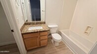 This two story 3 bedroom,2.5 bath home offers 1,547 sq ft of functional living space in Maricopa and is pet friendly. The kitchen features granite counters,electric range and oven,built in microwave,dishwasher,disposal,refrigerator,pantry,and an eat in dining area. No carpet throughout home. The primary bedroom is located upstairs and includes a full bathroom. A loft provides additional flexible living space. Two additional bedrooms offer room for family,guests,or workspace. Laundry hookups are located inside the home. Additional features include a 2 car garage and a backyard with covered patio and patio area. Located near community biking and walking paths,children's playgrounds,local parks,shopping,and dining within approximately three miles.