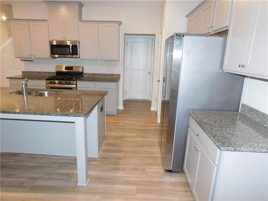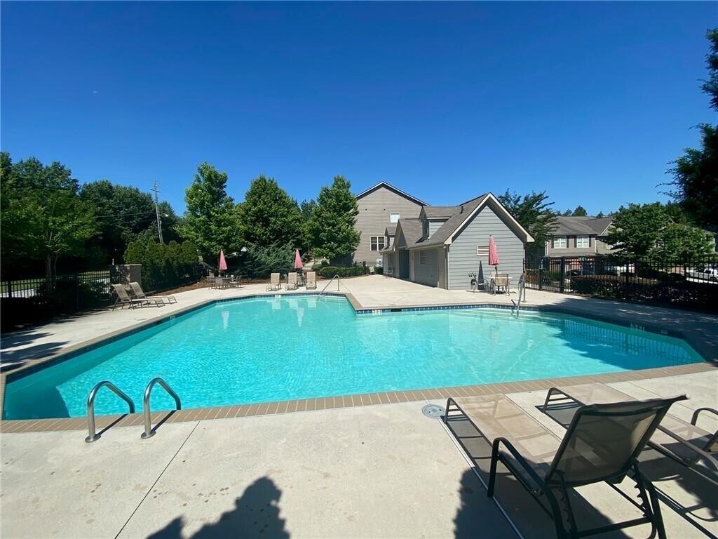 Enter this town home into a foyer that leads to an open floor plan with a kitchen with Granite counters/island/breakfast bar,grey cabinets,pantry,stainless appliances (gas stove,dishwasher,refrigerator,dishwasher),1/2 bath,living and dining areas with access to the rear patio. The upper level has a laundry room with a washer & dryer included. There are two spare bedrooms,full hall bath with tub/shower combination. The master suite has a trey ceiling and includes an attached full bath with dual vanities,soaking tub,separate shower,and large walk-in closet. There is a section of wood fencing in the backyard between the properties. There is a 2-car front entry garage. Landscaping and use of community pool is included. Good location near shopping and dining. No aggressive dog breeds. MLS ID 7720439