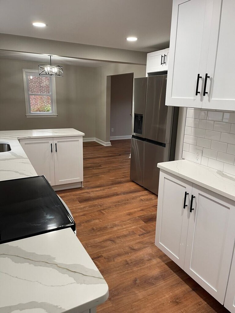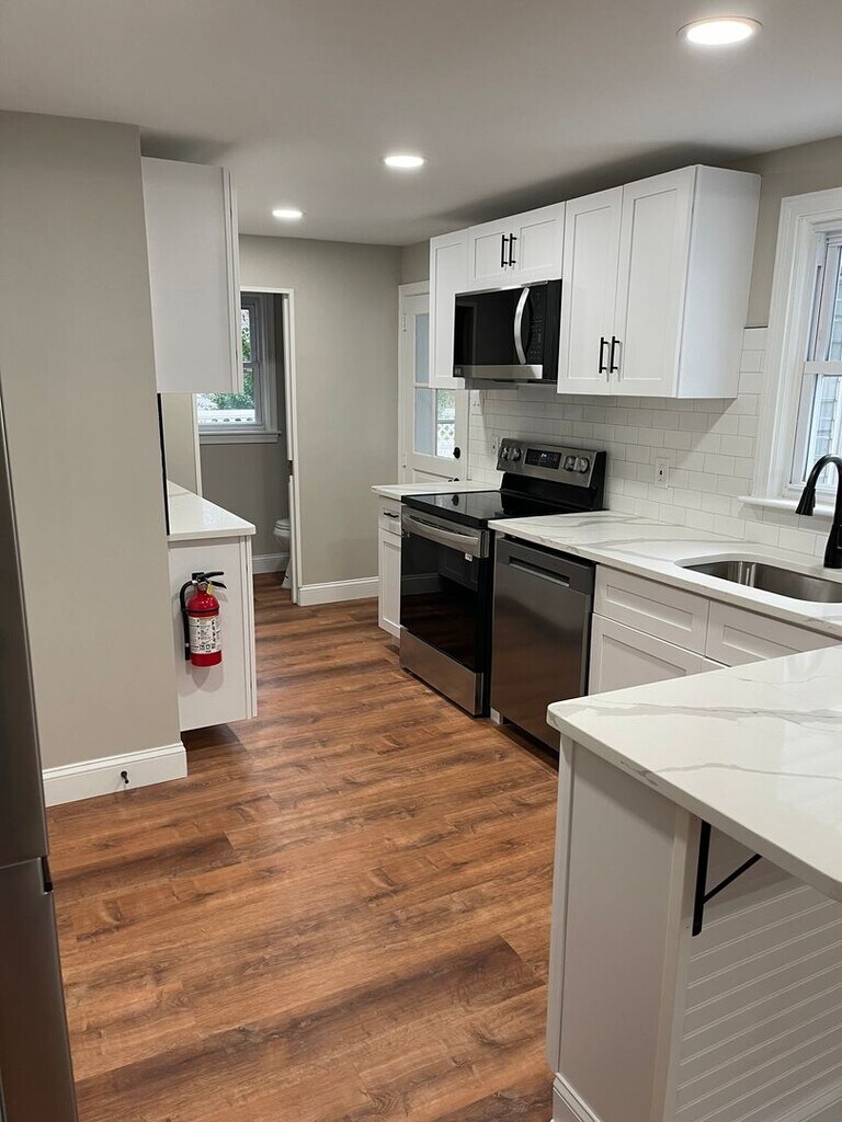 Totally renovated 2 story home. 3/4 bedrooms, 1/1 Bath with open floor plan. LVT flooring through out the 1st floor, carpet on steps and 2nd floor and tile in both bathrooms. Updated kitchen cabinets, counter tops and stainless steel appliances. Room off dining area could be used at a 4th bedroom or family room. 3 season room located off kitchen. Full basement with bilco doors to fenced rear yard. One car garage with interior access. Washer, dryer located in basement along with utility sink and HVAC system and hot water heater. Tenant is responsible for all utilities, yard maintenance, snow removal and trash. To schedule a showing contact our office at & applications can be found on our website