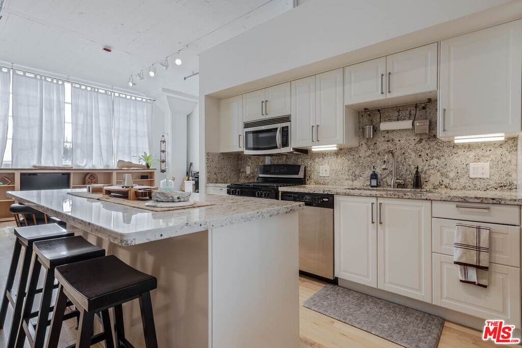Welcome home to this bright and airy 1 bedroom loft in the sophisticated Little Tokyo Lofts! From the magnificent vaulted ceilings to the industrial modern flair, fall in love with all the charm and design of this gorgeous unit in DTLA. The free-flowing floor plan is flooded with an abundance of natural light through the oversized windows and features hardwood floors throughout. A generously-sized, open concept living area provides endless options for configurations as a home office. Gather around the updated chef's kitchen that offers plenty of storage and showcases luxurious granite, perfect for entertaining. The bedroom is separated and tucked away towards the rear of the unit for ultimate privacy, providing sanctuary from the rest of the home and city. Not to be overlooked, the bathroom contains a stacked washer/dryer for maximum convenience and a tub that invites relaxation. The parking space is conveniently located on the same floor as the entry-level of the complex and there are ample parking spots for guests. This gated and monitored community includes a swimmer's pool, hot tub, fitness facility, dog run, BBQ area, grand courtyard and so much more. The stellar location of Little Tokyo Lofts is within minutes of the Japanese Village Plaza, Arts District and specialty restaurants and markets of Downtown LA. MLS# 25614475