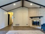 Beautifully maintained 3 bed, 2.5 bath home on a prominent corner lot. Soaring vaulted living room with exposed beams and statement fireplace creates an inviting focal point. Updated kitchen with crisp white cabinetry, light stone countertops, stainless steel appliances. Private primary retreat with en-suite bath featuring separate shower and dedicated vanity area. Wood-look tile flooring throughout main living areas. Covered patio and private backyard ideal for relaxing or entertaining. Prime location near shopping, dining, and major highways.