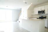 Two-story townhouse located in a newer construction community in North Fort Myers with attractive curb appeal and a one-car garage. The exterior features a concrete driveway,landscaped front entry,and a neutral color palette with modern architectural lines. The first floor offers an open-concept layout with large-format tile flooring throughout the main living areas. The kitchen includes white shaker-style cabinetry,solid surface countertops,a center island with double stainless sink,stainless steel appliances,recessed lighting,and an adjacent laundry area with washer and dryer. The living and dining areas provide ample space for seating and entertaining,with sliding glass doors leading to an open concrete patio. Upstairs features carpeted bedrooms and hallway areas. The primary bedroom includes a spacious layout,walk-in closet,and en-suite bathroom with dual vanities,solid surface countertop,and a glass-enclosed shower. Secondary bedrooms are well-sized with standard closets and share a full bathroom with tub/shower combination and tiled walls. The rear of the property overlooks a large green space and lake,offering open views and natural light. The patio is uncovered and provides direct access to the backyard lawn area. The home presents a clean,modern interior with neutral finishes throughout.