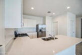 This lovely 3 bedroom home is ready for move in. Great open floor plan make this home light and bright. Nice kitchen with all stainless appliances and breakfast bar. The primary is split with dual sinks and walk in shower. Washer & Dryer stay for your convenience. Nice backyard with lush grass with Landscaping included and covered patio.