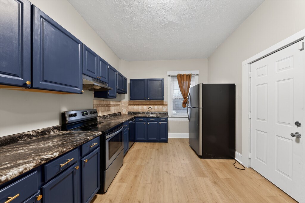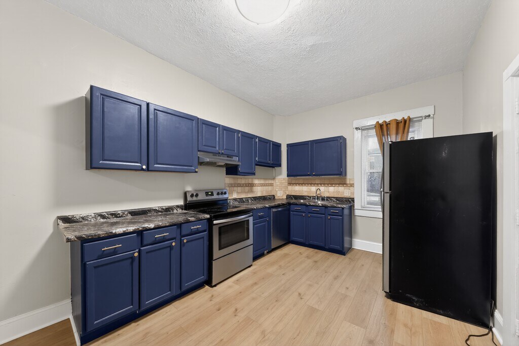 This home features a stylish kitchen with rich blue cabinetry, sleek countertops, and stainless steel appliances, offering plenty of storage and workspace. The bright, freshly updated interior includes beautiful wood-style flooring, neutral tones, and large windows that fill the space with natural light, creating a warm and inviting atmosphere throughout. Owner pays for sewer and garbage...