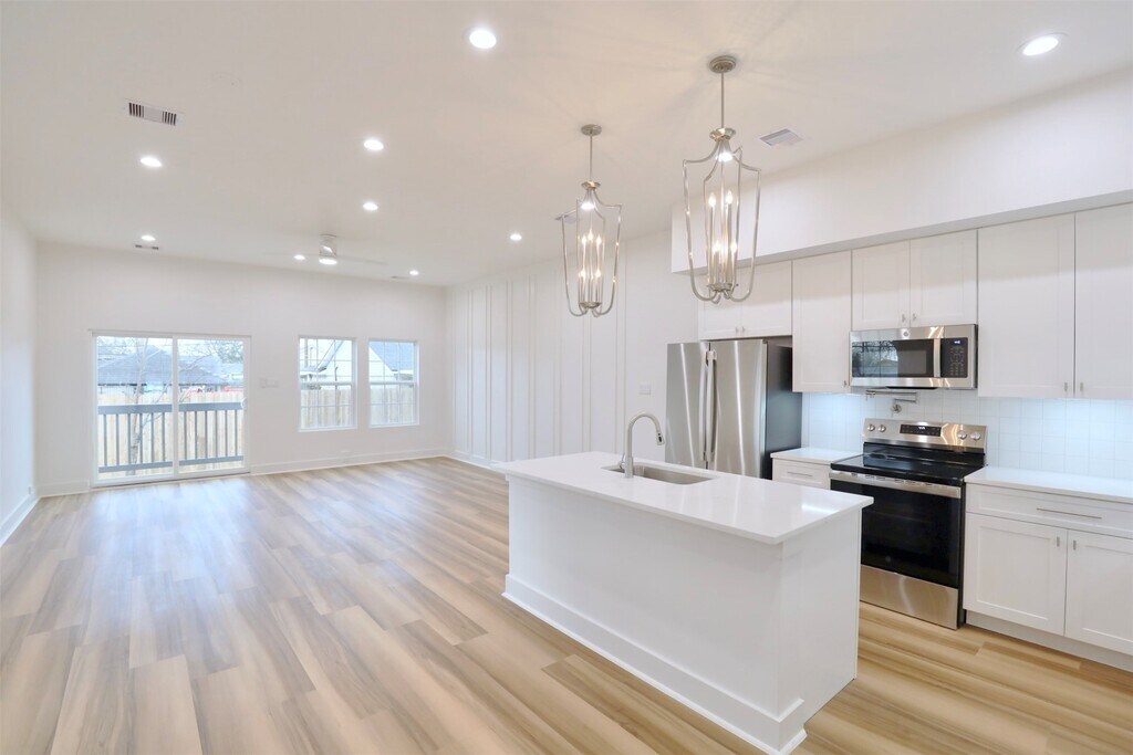 Pannu Homes & Arterno Duplex Collection: 3-color exterior palette of crisp white,deep charcoal,and warm accents. Situated on a rapidly developing street,the exterior is highlighted by modern light fixtures with complementary soffit lighting around the perimeter,creating striking curb appeal and functionality.Each home offers a private two-car garage,wide driveway,and elevated design details.Inside,10-ft ceilings and 8-ft grey satin painted accent doors enhancing the open,airy feel.The kitchen features a pot filler,sleek cabinetry,and dramatic counter-to-ceiling backsplash tile paired with under-cabinet lighting+ outlets.High-efficiency Trane AC providing comfort during Houston summers.Stair-step lighting adds a radiant glow,and a custom accent wall brings elegance to the living area.The primary suite features a private balcony,while the spacious backyard is ideal for entertaining or relaxing.(A + B UNITS ARE AVAILABLE FOR RENT)UNIT A(3 bed,2.5 bath) UNIT B(3 bed,2.5 bath) MLS# 94794162