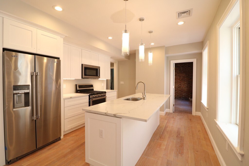 Be among the first to live in this stunning 4-bedroom,2 full bathroom residence in one of the most sought-after neighborhoods. Thoughtfully designed and fully renovated from top to bottom,this home blends modern finishes with exceptional comfort. The sun-filled living space features gleaming oak hardwood floors and recessed lighting throughout. The open-concept layout includes a spacious living room and an eat-in kitchen highlighted by a quartz waterfall-style island overhang - perfect for entertaining. The chef’s kitchen is outfitted with white shaker cabinetry,quartz countertops,and a full suite of stainless steel appliances,including built-in dishwasher,disposal,and microwave. Enjoy oversized bedrooms with generous closet space,brand-new Pella windows,and spray foam insulation for superior energy efficiency and year-round comfort. Central heat and A/C,tankless hot water,and laundry in the building add everyday convenience. No undergraduates,please. MLS# 73477489
