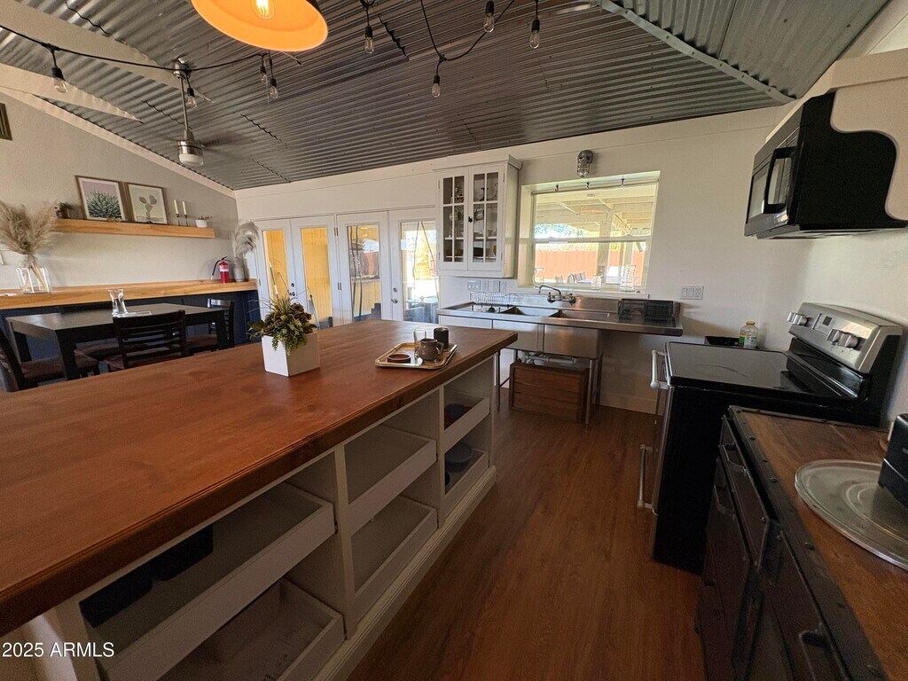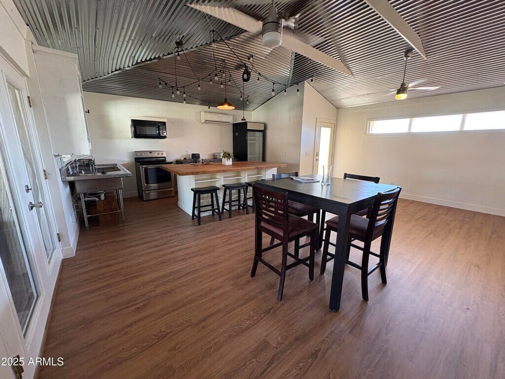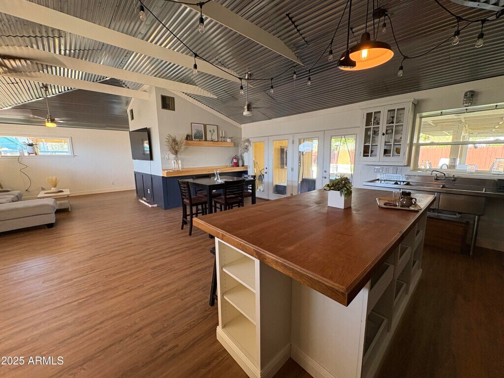 A truly one-of-a-kind rental opportunity,this vibrant and artistic home features two private primary suites,an open-concept unfitted kitchen,and a spacious great room with soaring 11-foot vaulted metal ceilings and stained concrete floors. Ideal for entertaining,the home includes two sets of glass double doors that open to a large covered patio with a full outdoor kitchen and built-in high-top table that seats eight. Just beyond,you'll find a sparkling swimming pool and brick barbecue area. This home is perfect for entertainers,creatives,or anyone seeking a unique living experience. Don't miss the chance to lease this extraordinary property!