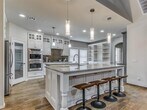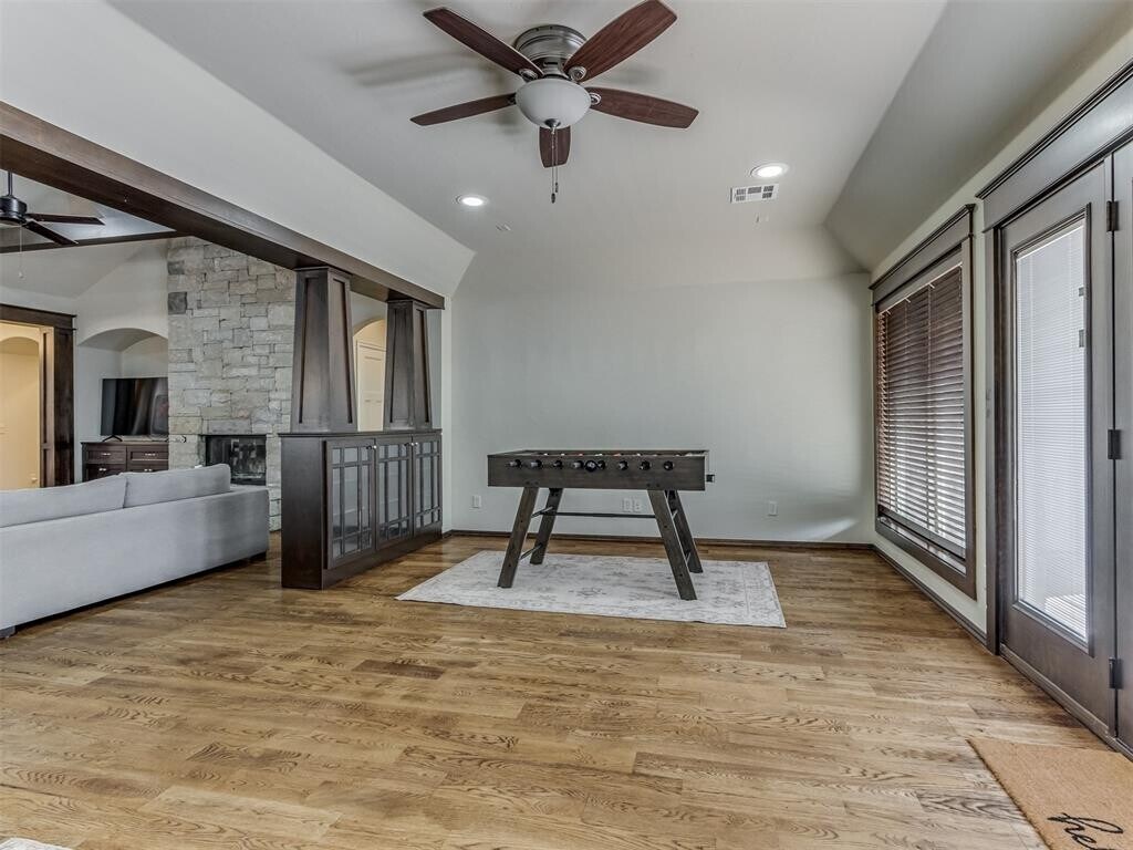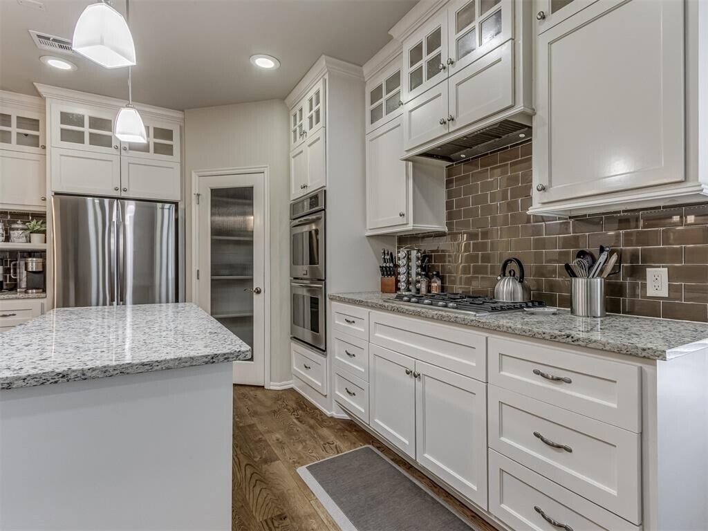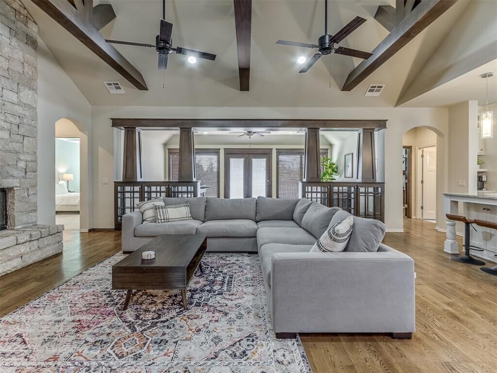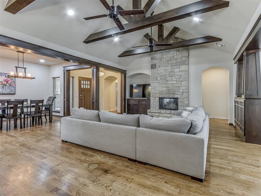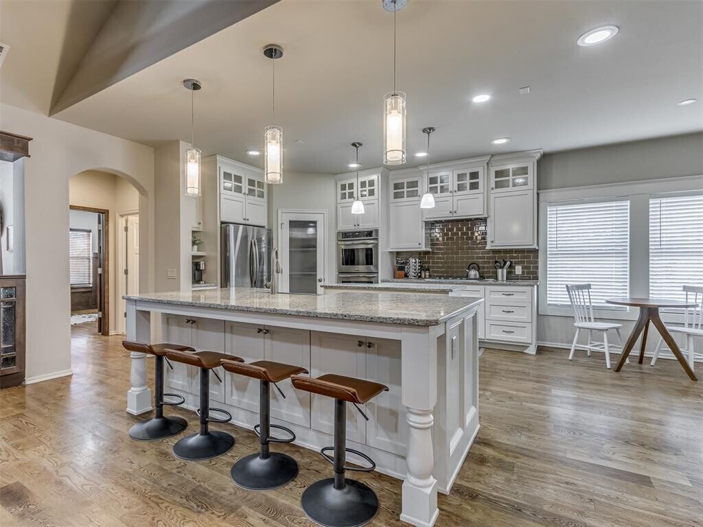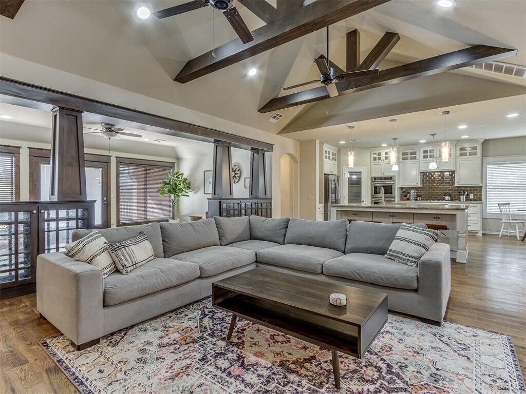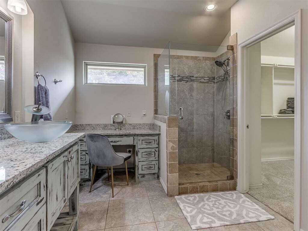 Nestled on a generous parcel of just over an acre in NE Edmond,this property offers the serene ambiance of country living with easy access to I-35. It places residents in the heart of convenience,close to schools,healthcare facilities,shopping centers,and entertainment venues. The essence of this home is captured in its expansive open spaces,designed for effortless living and distinguished by superior craftsmanship at every turn. The culinary dream kitchen is equipped with ample storage and countertop space,dual ovens,a gas stove,two islands,a deep stainless-steel farmhouse sink,and a walk-in pantry. Adjacent to the kitchen,a stunning study presents a versatile space,perfect as a playroom or TV lounge,complemented by a full bathroom. A cathedral ceiling adorned with wooden beams and a striking floor-to-ceiling stone fireplace accentuates the main living area. The owner’s suite is a sanctuary of comfort,featuring a large walk-in closet and a spacious bathroom that offers a variety of customization options,including laundry connections. It also provides private access to an expansive covered deck. An oversized three-car garage boasts an automated lift for attic access (and easy seasonal storage) and an epoxy-coated floor. The community enhances this idyllic setting with two ponds and ample greenbelt areas,ensuring a picturesque and tranquil living experience.