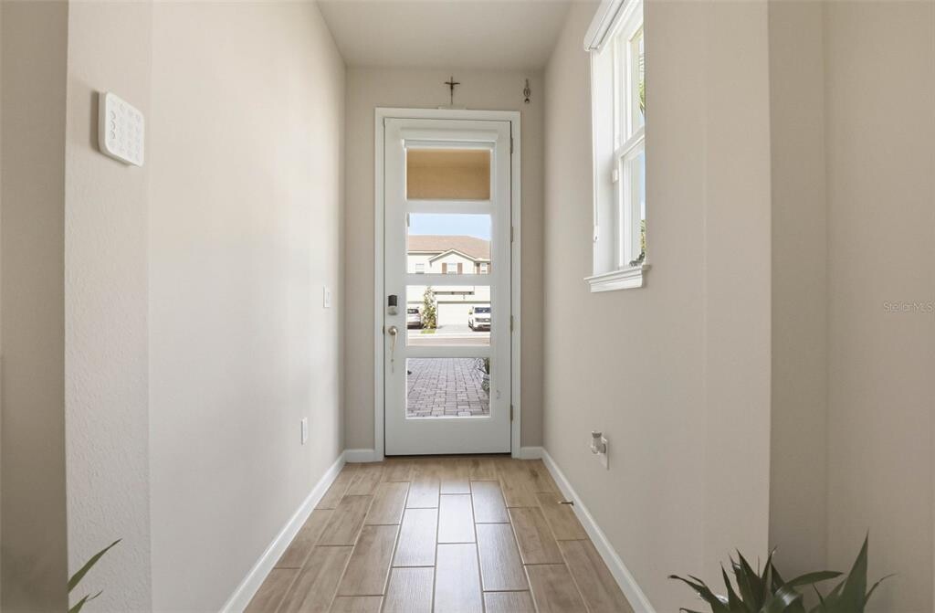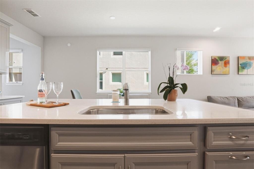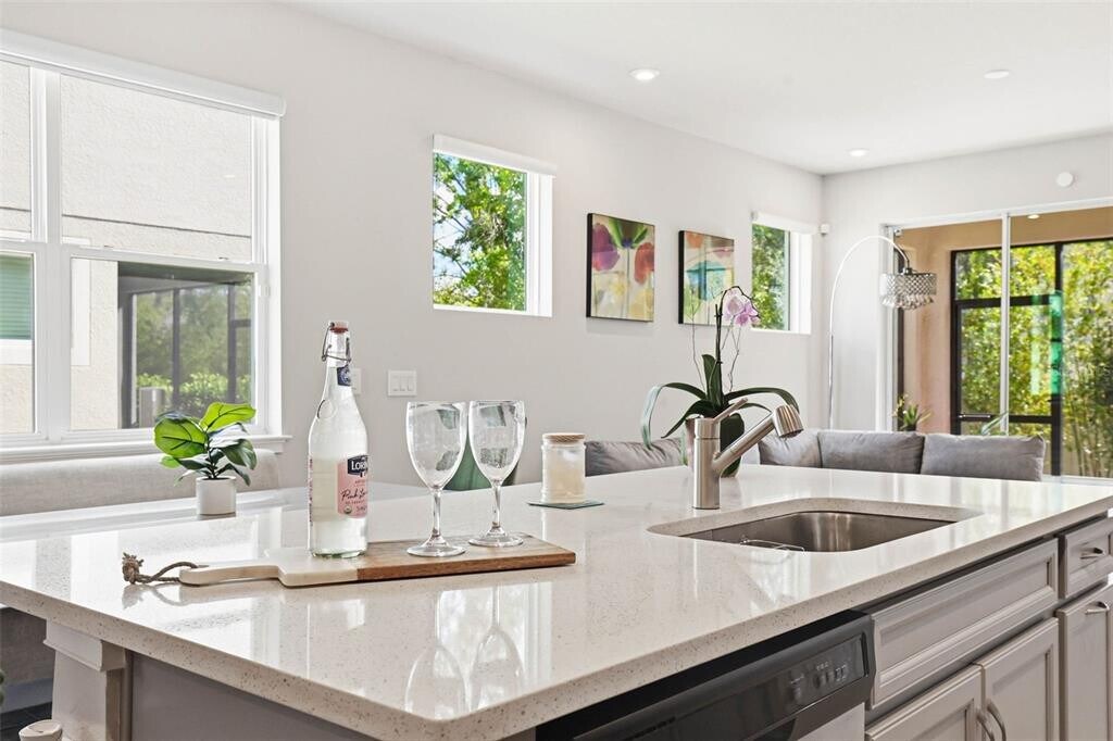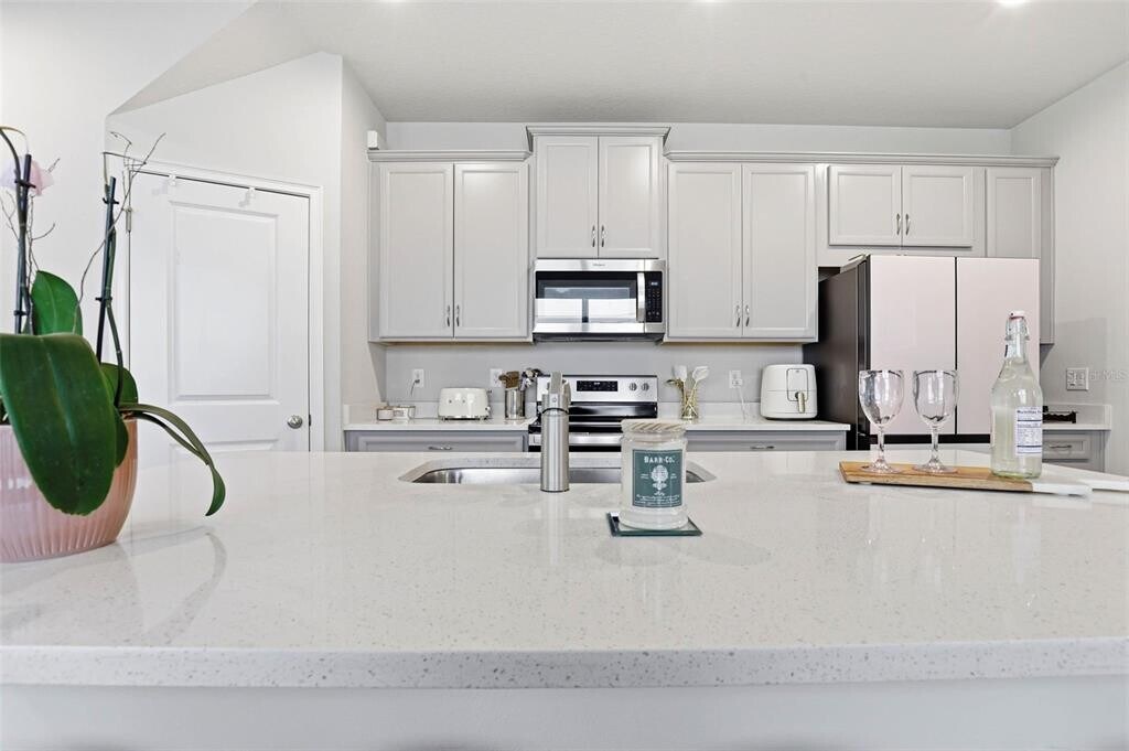 One or more photo(s) has been virtually staged. As you approach,a paver oversized driveway and covered entryway create a polished first impression,leading to a striking metal-framed glass front door. Inside,an immediate sense of openness is created by the abundance of natural light that flows throughout the home,illuminating the wood-style tile flooring that spans the entire first floor,along with recessed lighting that enhances the modern aesthetic. The entryway opens into a beautifully appointed kitchen that serves as the heart of the home. Quartz countertops provide ample workspace,while an abundance of cabinetry with crown molding offers both style and storage. Stainless steel appliances—including a range,dishwasher,microwave,and an updated interchangeable color panel refrigerator—add a sleek,contemporary touch. A spacious island with seating anchors the space,complemented by a large closet pantry for added convenience. The dining area flows seamlessly from the kitchen into the living room,creating an ideal layout for both everyday living and entertaining. Expansive glass sliding doors—designed to fold into each other—lead to the outdoor space,allowing for effortless indoor-outdoor living. The first floor is completed by a half bathroom,additional storage closet,and a built-in mud area. Upstairs,a versatile loft just off the staircase offers flexible use as a home office,media room,play space,or secondary living area. The primary suite is designed as a private sanctuary,featuring three walk-in closets that provide exceptional storage. The ensuite bathroom showcases a glass walk-in shower,dual sink vanity with quartz countertops,and recessed lighting. Bedrooms two and three are both spacious and include walk-in closets. A second full bathroom with quartz countertops and a large vanity,along with a conveniently located laundry closet,complete the upper level. Step outside to a covered and screened lanai,thoughtfully designed as a private outdoor retreat. The addition of a grass wall backdrop enhances the space,creating a peaceful,low-maintenance setting ideal for relaxing or entertaining year-round. Residents of Volanti enjoy access to community amenities including a pool,firepit seating area,and walking trails,all contributing to a low-maintenance lifestyle. Conveniently located near I-75 and I-275,this home offers easy access to Advent Hospital,BayCare Hospital,PHSC,AdventHealth Center Ice,The Shops at Wiregrass,and Tampa Premium Outlets—placing shopping,dining,and everyday essentials just minutes away. Tenant is responsible for Electric,Trash & Water. Requires 1st last and security (Security $2,300). MLS# TB8490998