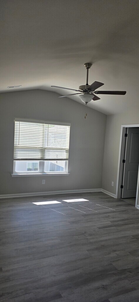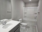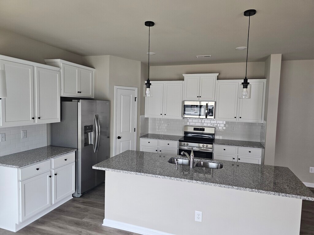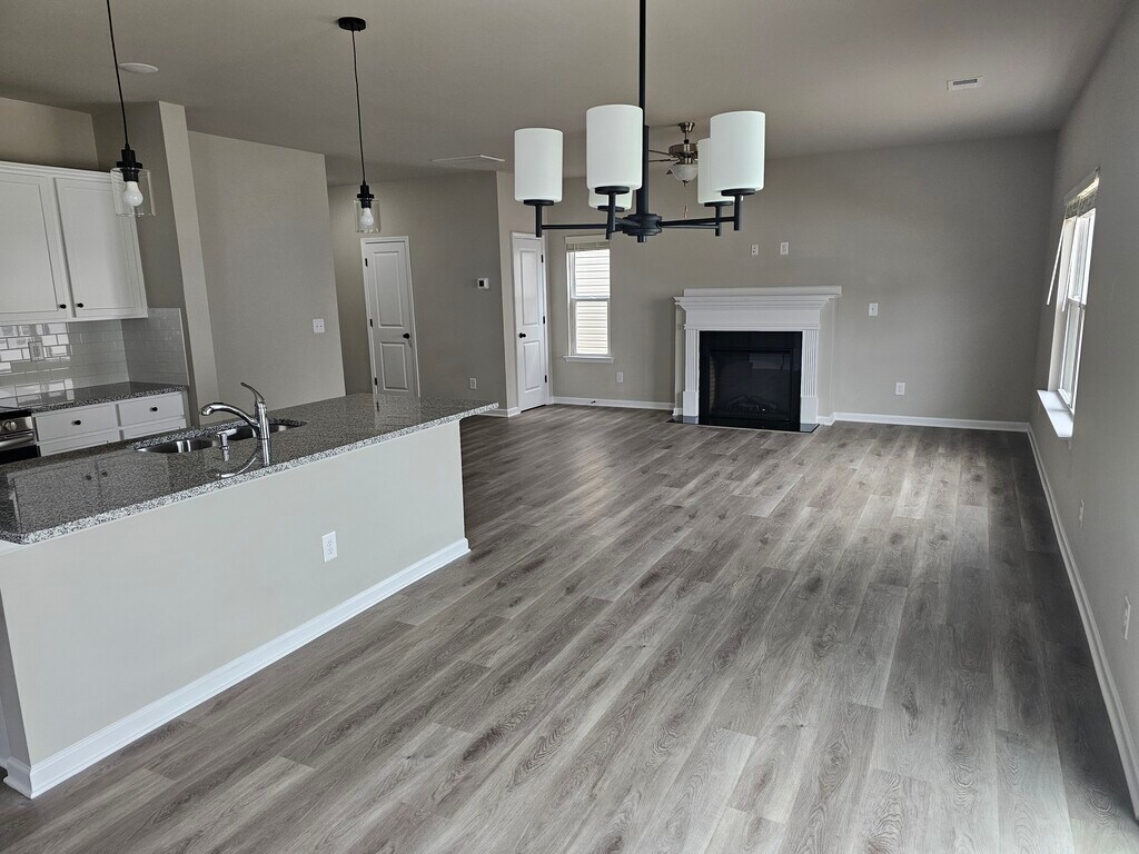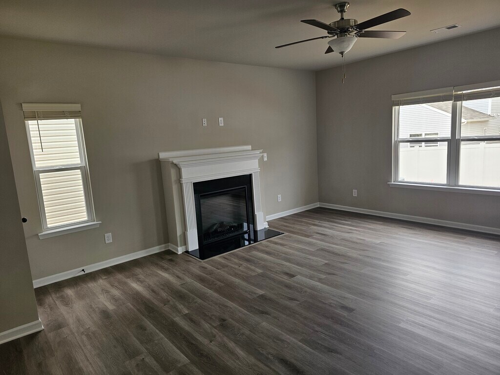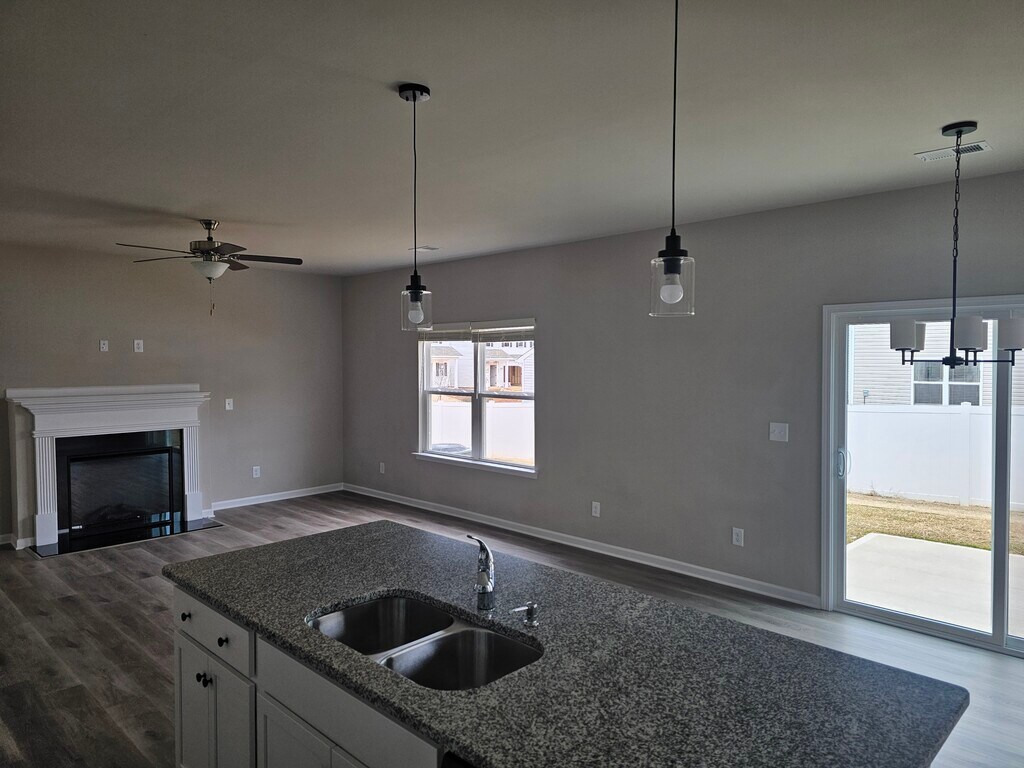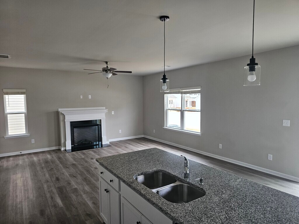 Beautiful luxury vinyl floors, 9 foot ceilings and a cozy fireplace welcome you into your open plan living area. The eat-in kitchen has granite countertops, stainless steel appliances, a subway tile backsplash and modern light fixtures. Open living room, kitchen with an island offer a great place to dine and entertain. Backyard patio, making it a perfect place to relax! Upstairs has 4 bedrooms. The master bedroom has a vaulted ceiling and an en suite bath with a dual sink vanity and a walk-in closet. Three additional bedrooms share a second full bath that's located in the hallway. Laundry located upstairs. Attached two car garage with an adapter for electric vehicles, available. Your new neighborhood is close to parks, golf, and a short drive to grocers, dining and entertainment! Tenant is responsible for all utilities. Renters Insurance is required Ready to Move-in