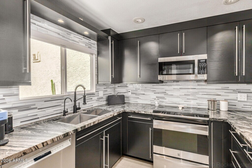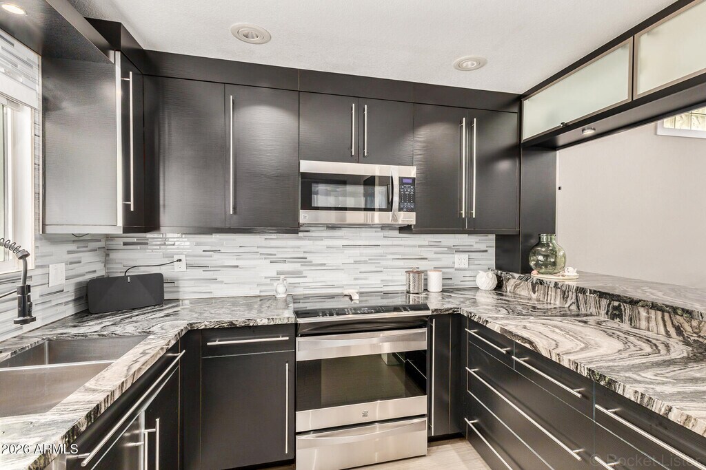 FEELS BRAND NEW! Come fall in love with this incredible home,a truly transformative remodel with a modern feel! Nestled in a quiet Biltmore community,step inside to enjoy this Turn Key Home with an OPEN & BRIGHT floor plan. Fresh paint,NEW tile flooring throughout and a NEW kitchen! The kitchen is the center for the home with Quartz countertops,custom modern flat panel designer cabinetry,Luxury SS Appliances,glass smooth top stove and tons of counter space. The kitchen opens up into the Great Room,for easy entertaining. The Master Suite is downstairs with remodeled bath and a huge walk-in closet! 2 secondary bedrooms and two fully remodeled baths!! You can feel the pride of ownership and thoughtful attention to detail throughout! Two perfect patios perfect to relax after a long day.