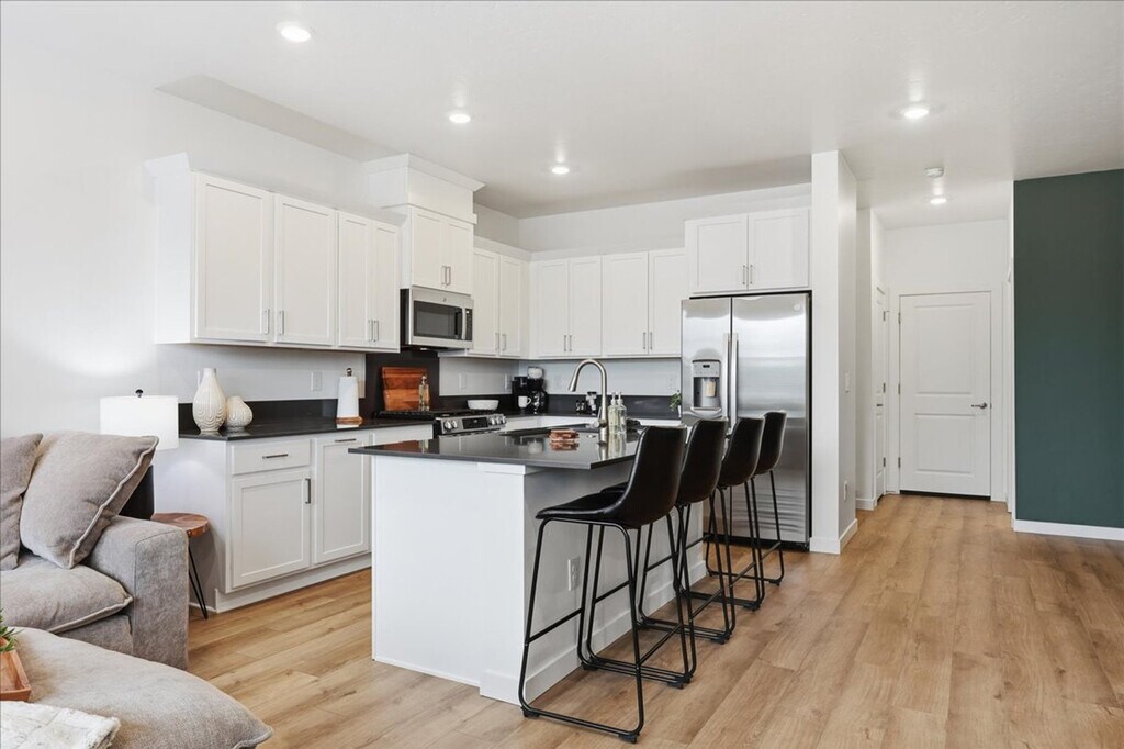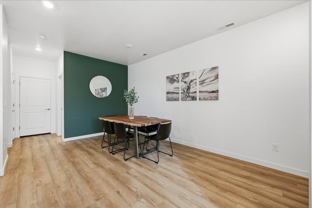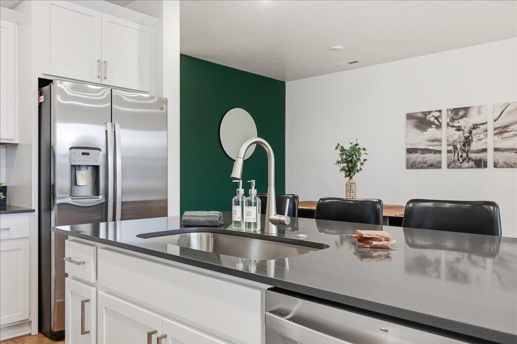 Feel at home in this modern, brand new home in Eagle. This home comfortably sleeps 9 and you will have access to the entire place during your stay. This professionally decorated space features unique furnishings and a warm ambiance. The kitchen comes fully loaded with stainless steel appliances such as a microwave, fridge, stove, and dishwasher, along with glasses, mugs, dishes, and cutlery. Complimentary live TV and coffee are provided. Garage access is available for parking. This is a pet-friendly home with a dog park on the other side of the road. Across the road from Eagle Island State Park and close to the downtown restaurant scene, this home is in a prime location. Townhouses sometimes have additional noise with neighbors, though this has not been an issue. The neighborhood is new construction, and during the day, there is construction on about half of it, so you may notice dust and work noise when you go outside and may hear some from the living room and master bedroom. Fast Wi-Fi is available, ideal for working remotely. [SI]