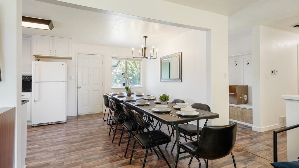 Welcome to the ultimate entertainment retreat in the heart of Utah Valley! This amenity-packed home is perfect for family gatherings, group vacations, or weekend getaways. With endless indoor and outdoor fun for guests of all ages, you'll feel at home in this one-of-a-kind adventure property. The inviting living room features a sectional for your comfort, plenty of seating for the family, and a large smart TV for entertainment. The kitchen is fully equipped with modern appliances, ample storage, and a complete set of kitchen tools, including a coffee maker, blender, toaster, and electric kettle. The elegant dining area seats up to eight, with an extra folding table and chairs available for larger gatherings. Guests will have access to the entire house, garage, and yard, with the exception of the storage closet in the basement and the storage shed in the backyard. Parking information is available on the listing, and street parking is permitted where signage indicates. Conveniently located, this home is just 10 minutes from BYU and UVU, 15 minutes from Provo Canyon hikes and waterfalls, and 45 minutes from ski resorts. You'll also find yourself minutes away from lakes, restaurants, and shopping, making it easy to explore all that the area has to offer. A doorbell camera and noise decibel detector are in place to monitor any unapproved parties. Smoking or vaping is not allowed on the premises, with a $200 per day fee for violations. Pets are welcome at a cost of $10 per pet, per day, with additional charges for cleaning and damages. Quiet hours begin at 10:00 PM and continue until sunrise. Please lock and close all windows and doors upon leaving to avoid wildlife encounters. The property includes a variety of entertainment options, such as a hot tub, pickleball, mini golf, arcade games, a foosball table, board games, a music room with a record player and instruments, and a poker table. Wi-Fi is available throughout the home, making it remote work-friendly. [SI]