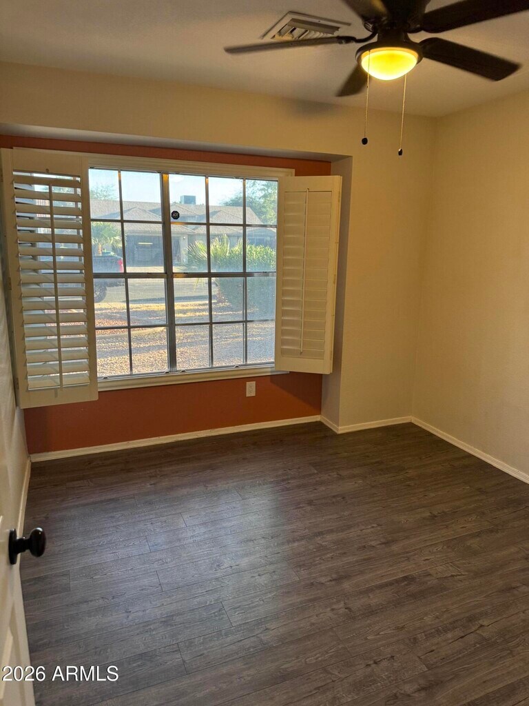 This home is in a highly sought out area. 3 Bedroom 2 bath home with a Family Room and Formal Dining area/flexible area. Wood burning Fireplace in the Living Room,French doors lead to the low maintenance back yard with a cover patio,patio pavers,artificial grass,raised flower beds/place to garden. Kitchen has plenty of kitchen cabinets,granite counter tops,an island,stainless Steel appliances,corner walk-in pantry. Inside washer and dryer. The primary bedroom has a barndoor for privacy,plant shelves,and a walk-in closet. Primary bathroom has dual sink,granite counter tops and a garden tub/shower combination. Water closet. Plantation Shutters. This is within the Kyrene School District (please confirm) Not Cats allowed and dogs would be considered but must be approved.