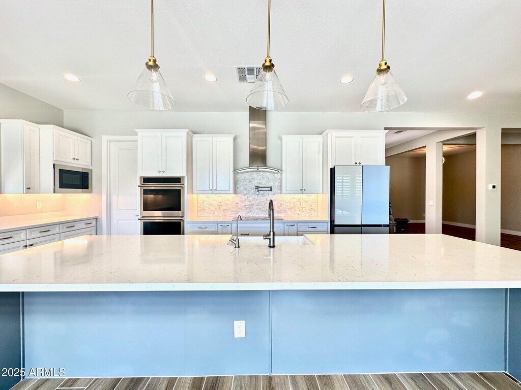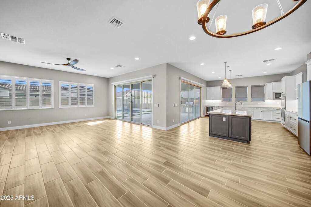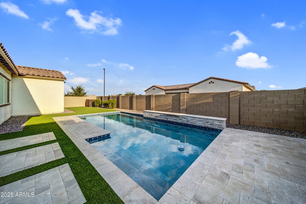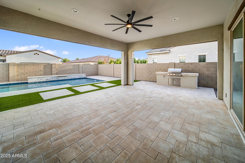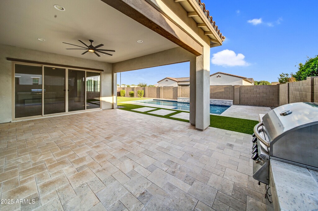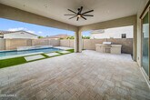 A beautiful single-story home in a highly sought-after gated community in Chandler. Built in 2021 and meticulously maintained by homeowners. Offering 5 bed,4 bath,a den,a flex room with double built-in desks,open concept living room,a 4 car-2 separate garages(240V outlet built-in for EV). The backyard features a large pool with a huge covered-patio,built-in grill perfect for entertaining,artificial grass for low-maintenance. Inside,enjoy a chef's kitchen with double ovens,a wine cooler,and a large pantry. RO water,water softener,washer/dryer,ceiling fans in each room,automated blinds to enjoy the beautiful sunset. This serene,family-oriented community is surrounded by A+ rated CUSD schools,Charter schools,and walking distance to Veteran Oasis Park and close to 202 highway