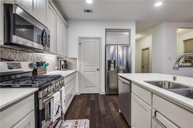 Beautiful luxury spacious end unit townhome with gorgeous main level open design, high ceilings throughout, and massive main suite bedroom. 3 bedrooms, 3 baths, 2 car attached garage, loft, pocket office, something for every family member. Beautiful hard surface counters throughout. Gourmet kitchen with stainless steel appliances plus gas range and exterior vent. Custom site finished cabinets throughout (42 inches in kitchen). Energy efficient with a 16 SEER HVAC system, radiant barrier, Ecobee programmable thermostats upstairs and downstairs, 2 zone system. Front entry ring doorbell camera included with the house. A well-done home that will impress for years to come. HOA takes care of all yard maintenance; never worry about the yard. Proximity to Arlington's entertainment district, neighborhood restaurants, shopping, major highways, Dallas Cowboys Stadium, Texas Rangers Ballpark, Six Flags, and Airport. Ready for tenants to call home, don't miss this opportunity and location! Security deposit special and all pets are free. No monthly fees or extra deposits for your pets!