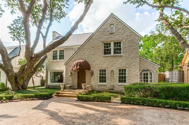 This charming Highland Park Tudor sits on a 60 x 150 lot, greeting you with all of the curb appeal in a circle drive, mature trees, and a classic stone facade. Enter in to hardwood floors, an abundance of windows, and exquisite millwork on all of the ceilings and baseboards. The interior boasts expansive living and family rooms, adjoined to a sun-filled study with its own access to a porch on the front of the house. The kitchen is a chef's dream, featuring a 6 burner gas range and commercial vent, stainless steel appliances, granite countertops, and an eat-in nook as well as a spacious formal dinning room. The outdoor oasis is the centerpiece of the home, complete with an outdoor living area, kitchen, pool, and turfed yard. The roomy primary enjoys separate bathrooms and closets for each partner, while 2 guest bedrooms offer all the space needed for kids or guests, alike. A guest quarters completes the home, with a full additional bedroom or office with its own en-suite bathroom and 1 car garage. A quick walk to Highland Park Village, Dallas Country Club, and Bradfield Elementary.