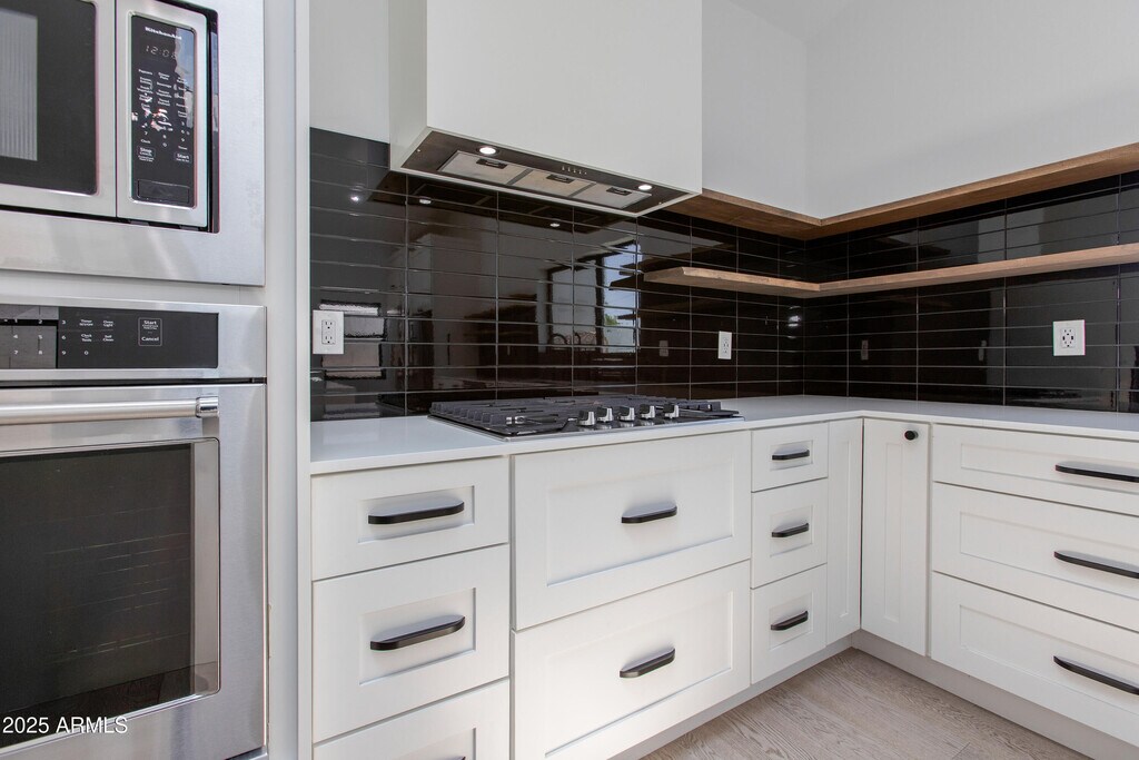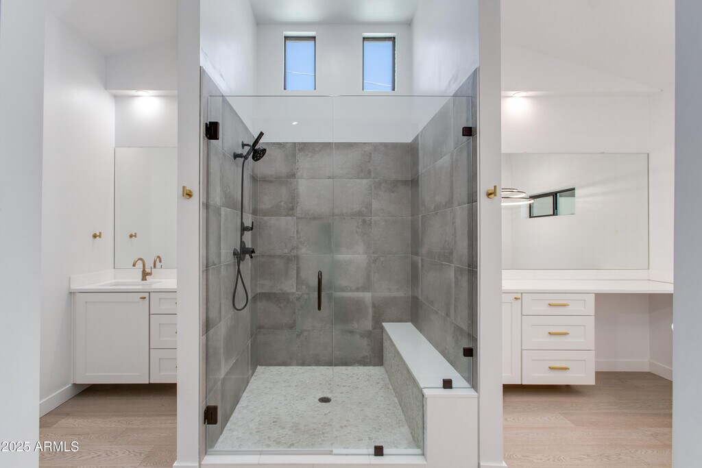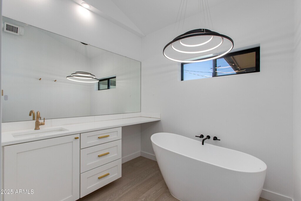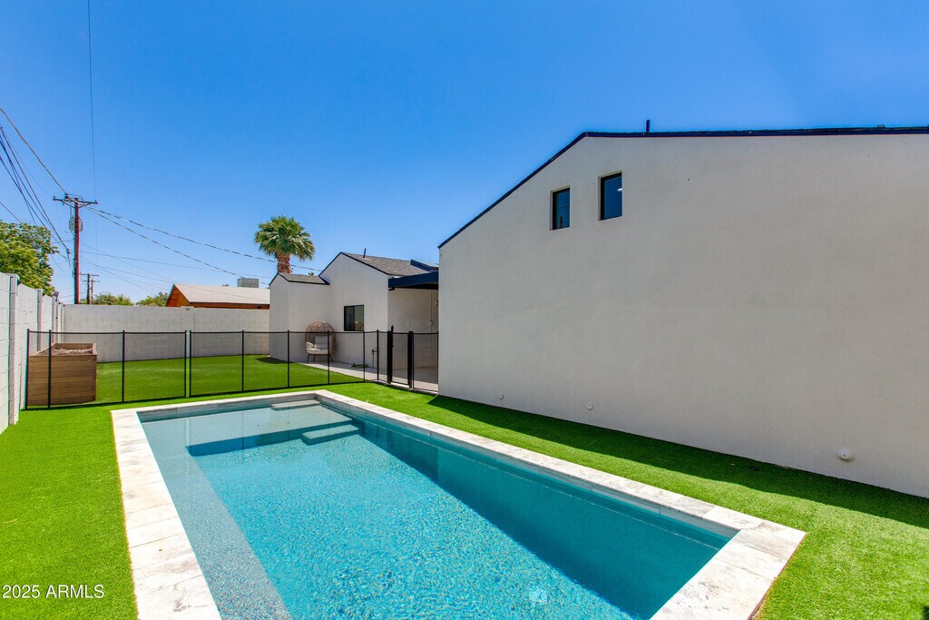 Completely reimagined Arcadia Lite residence featuring 3 bed and 3.5 baths across 2,372 sqft. Every detail of this home reflects thoughtful design and premium craftsmanship. Step inside to soaring vaulted ceilings and an open floor plan bathed in natural light,grounded by gorgeous hardwood flooring throughout. The heart of the home is a stunning kitchen,boasting a massive quartz island with seating,custom cabinetry,high-end appliances,skylights,and a discreet walk-in pantry. Each bedroom has an ensuite bath,while the luxe primary suite offers patio access,dual vanities,oversized glass shower,soaking tub,and a custom closet. Outside,enjoy a spacious backyard with private pool. Fully renovated in 2020 with new plumbing,electrical,dual HVAC,roof,and more!