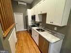 This first-floor efficiency apartment is small, but was totally renovated with a local designer, creating an exceptional living space that includes a raised loft space for your bed, a beautiful kitchen, living/dining space with a 10' - 6 ceiling, a plush bathroom with an attractive tiled shower with champagne bronze faucets and a large single vanity. Also in this space is your own front-loading washer & dryer. Unique, practical and gorgeous first floor apartment. Owner pays water & sewer, you pay electric. One off-street parking space is included. Available immediately. No Pets. Credit scores of 650+. No smokers. On-line application with RentSpree."
