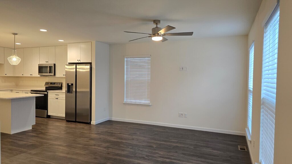 New McBride Homes row home with 2 bedrooms and 2.5 baths available now! This desirable end unit features an open floor plan with a bright, spacious living room, ceiling fan, and an extra window that fills the space with natural light. The kitchen offers an island with breakfast bar, 42" Benton Sarsaparilla cabinets, quartz countertops, and GE stainless steel appliances, plus a breakfast room with sliding doors. The main level also includes a powder room and wood laminate flooring throughout. Upstairs, you'll find two generously sized bedrooms with walk-in closets, a large loft, two full baths, a laundry area, and a linen closet. Additional highlights include a full basement and a rear-entry one-car garage. Harvest offers outstanding amenities such as a nature play area with water feature, 13+ acre town square and civic lawn, food truck court, orchards and pumpkin patch, community gardens, pickleball and bocce ball courts, playgrounds, trails, and more. Includes McBride Homes' 10-year builder warranty and exceptional customer service.