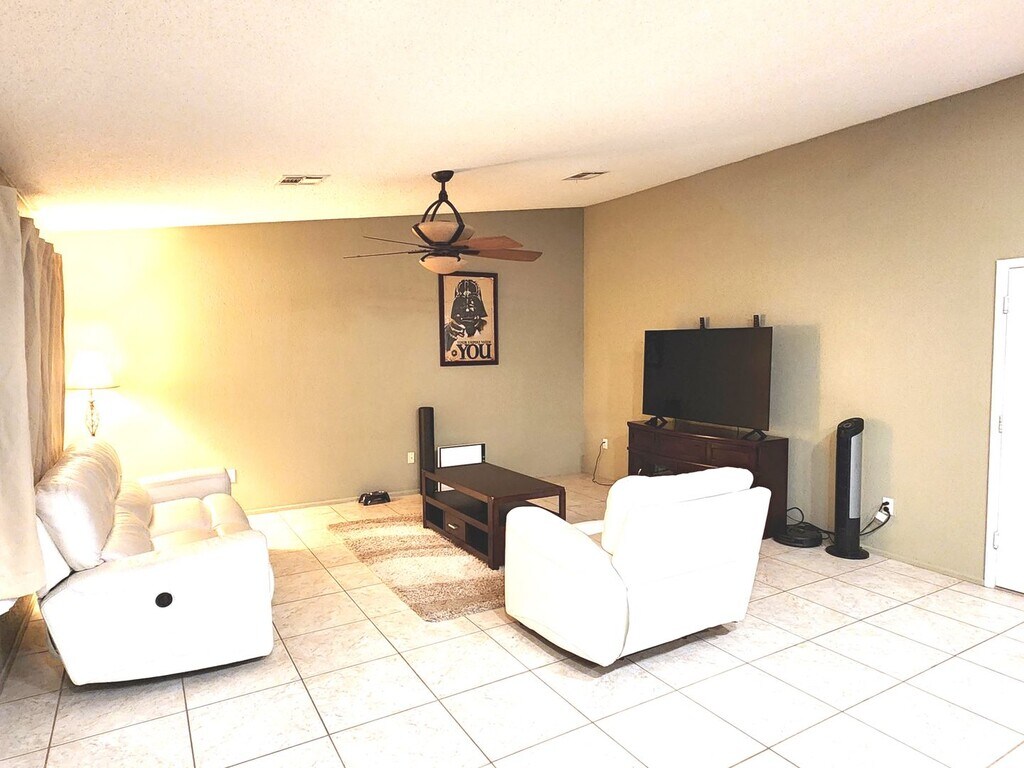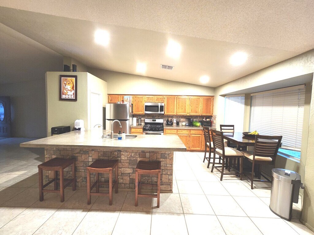 4 bedroom, 1.75 bath home with 2 car attached garage in Ocotillo subdivision. Open floor plan with ceramic floor tiling and luxury vinyl throughout (no carpet!), vaulted ceilings, formal living room, and large family room. Upgraded kitchen with concrete countertops, stainless steel appliances, extra cabinetry, and walk-in pantry. French door leads to covered rear patio, huge yard, and 2 storage sheds. Available August 1st.