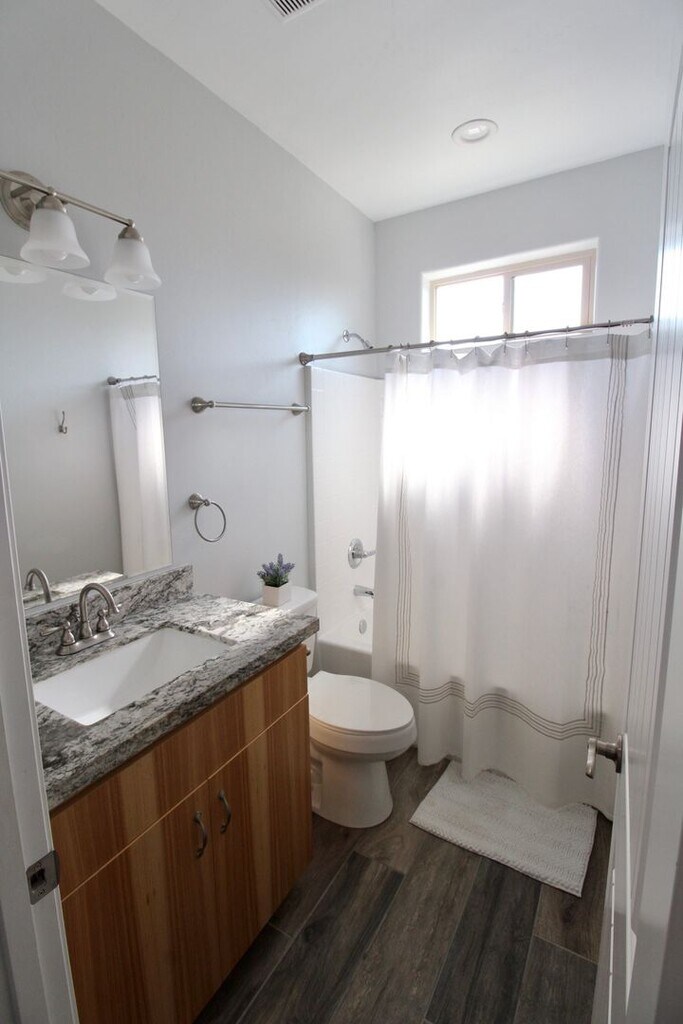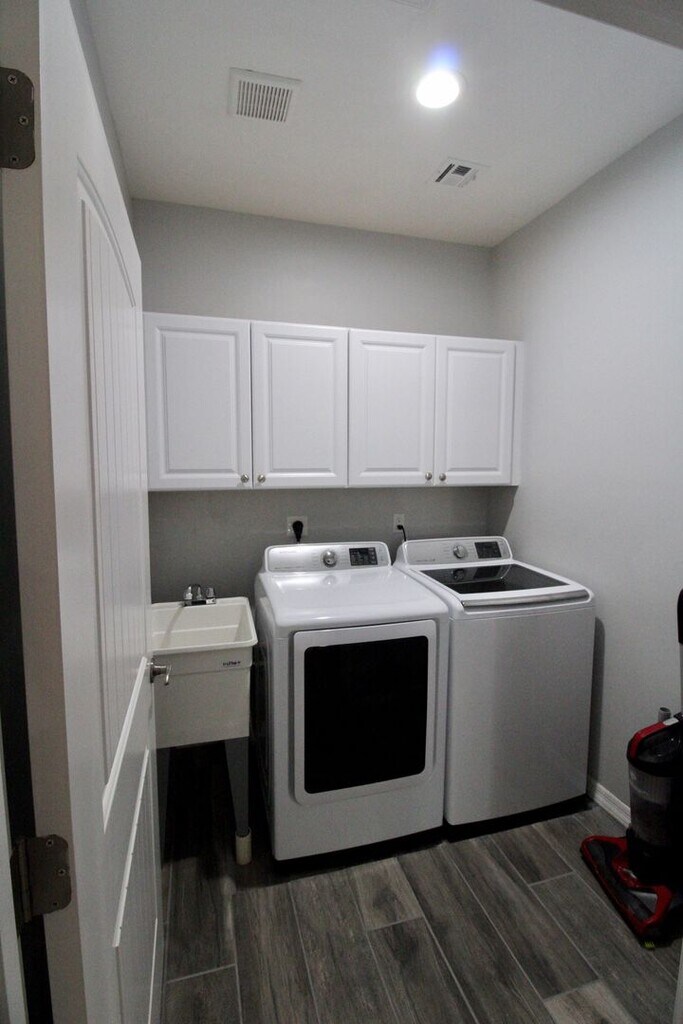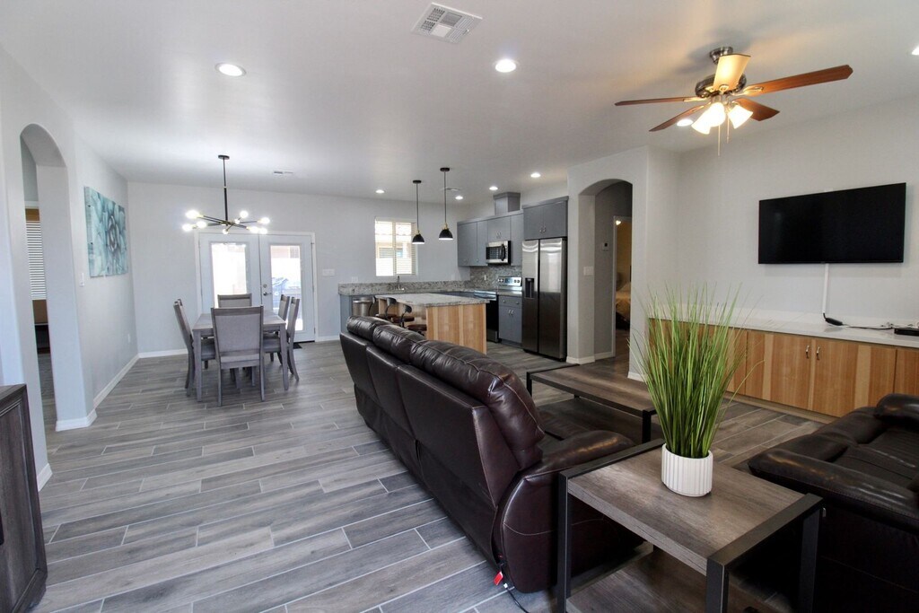 3-bedroom, 2-bathroom home located on the cul-de-sac. This home offers a modern and stylish design with tile flooring throughout, providing a sleek and clean look. The kitchen features stunning granite countertops, perfect for preparing meals and entertaining guests. You'll also find a convenient washer/dryer and refrigerator included, making laundry day a breeze. The primary bedroom boasts a large closet, providing ample storage space for all your belongings. With a two-car garage and a double side gate, you'll have plenty of room for parking and storing your vehicles. The primary bathroom features double sinks. Outside, you'll find low-maintenance landscaping, allowing you to spend more time enjoying your new home and less time on yard work. This home is perfect for those seeking a comfortable and convenient lifestyle.