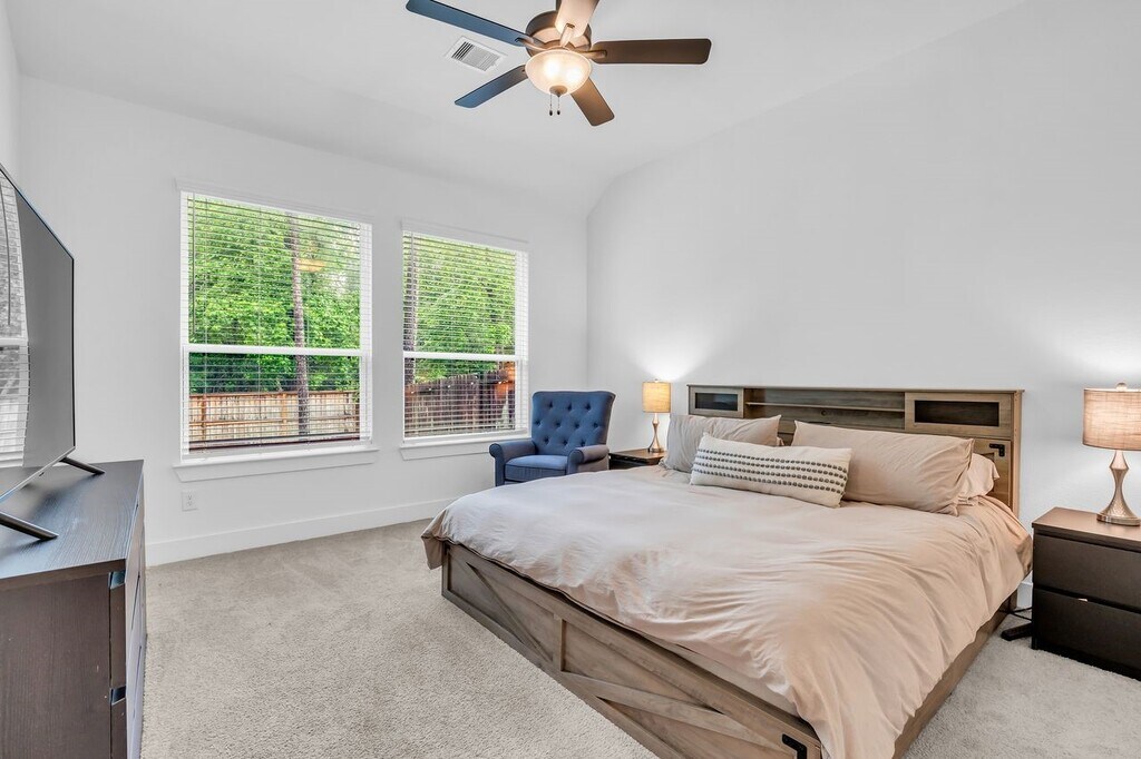 This stunning Chesmar "Sedona" floor plan offers a modern design and resort-style living in the premier master-planned community of Woodforest. The two-story,energy-efficient home features 4 spacious bedrooms,2.5 baths,and a large upstairs game room,all situated on a quiet loop in the heart of Montgomery. Designer Kitchen Features 42” cabinetry,3CM granite countertops and high-end stainless-steel appliances. Refrigerator,Gas Range,Microwave,Dishwasher. Located on the first floor for featuring a spa-like ensuite and large walk-in closet. An open-concept family room flows seamlessly into the dining area and out to a covered rear patio,spacious yard with no back neighbors. Wood-look tile flooring,mahogany front door,and 3-sides masonry (brick/stone) exterior. Energy Efficiency Built with LoE3 windows,a radiant barrier roof,and 16 SEER HVAC to keep utility costs low.42-ft slide tower and pools,trails and parks.27-hole Woodforest Golf Club and fun Activities MLS ID 57396652