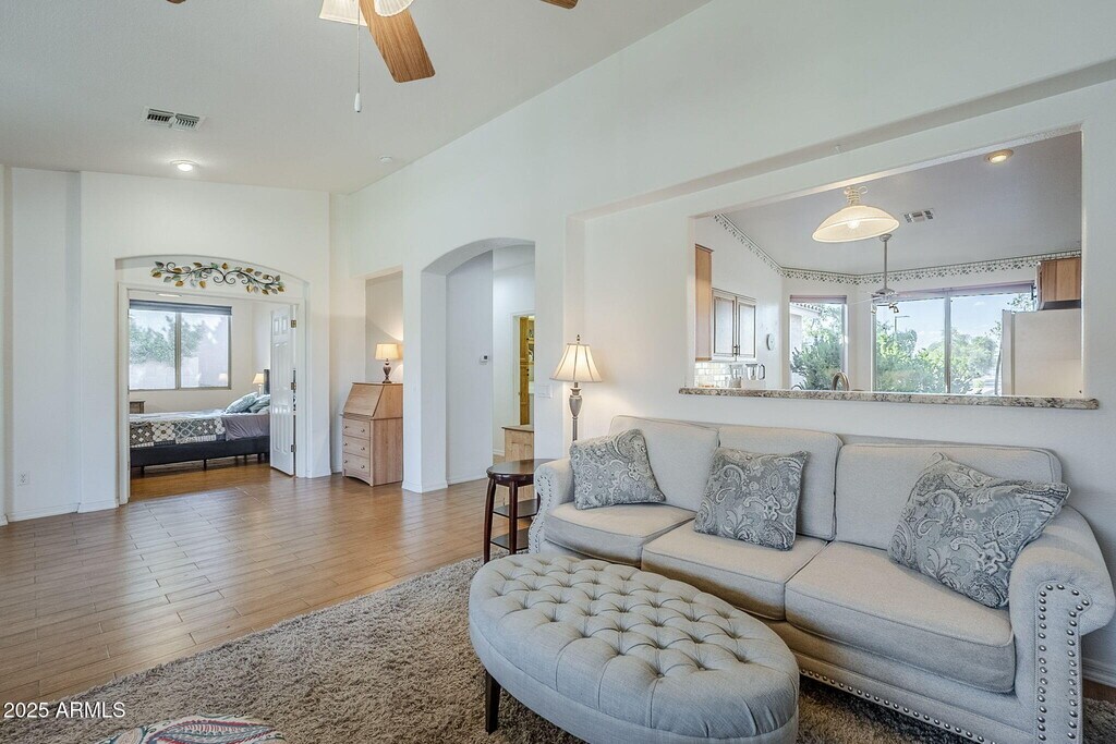 Located in the highly sought-after 55+ gated community of Trilogy at Power Ranch,this beautifully maintained 2 bedroom,2 bathroom home with a versatile den/office offers 1,407 sq ft of open-concept living space,a spacious primary suite with walk-in closet and en-suite bath,a light-filled great room,eat-in kitchen with ample cabinetry,and a private covered patio perfect for relaxing. The home also features a 2-car garage,indoor laundry,and includes professional landscaping service. Enjoy resort-style amenities including a clubhouse,fitness center,pools,spa,tennis,pickleball,bocce ball,walking trails,golf access,and a full calendar of social activities. Conveniently located near shopping,dining,medical facilities,and Loop 202.