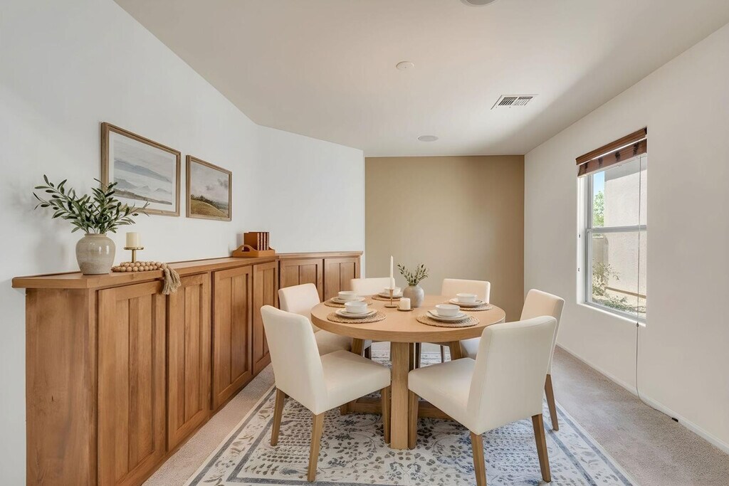 This charming,move-in ready home features brand new carpeting and a highly functional,open floor plan with 3 bedrooms plus a spacious den. The split master offers added privacy,and the main living area is bright and inviting with vaulted ceilings and 100% usable space. Washer,dryer,and refrigerator are included. The low-maintenance landscaping makes everyday living easy. Located on the north side of Maricopa with quick access to Hwy 347,shopping,dining,schools (walking distance to the elementary school),parks,fire department,and golfing at the Duke...this home is perfect for comfortable living and entertaining!
