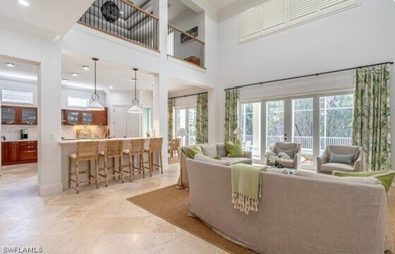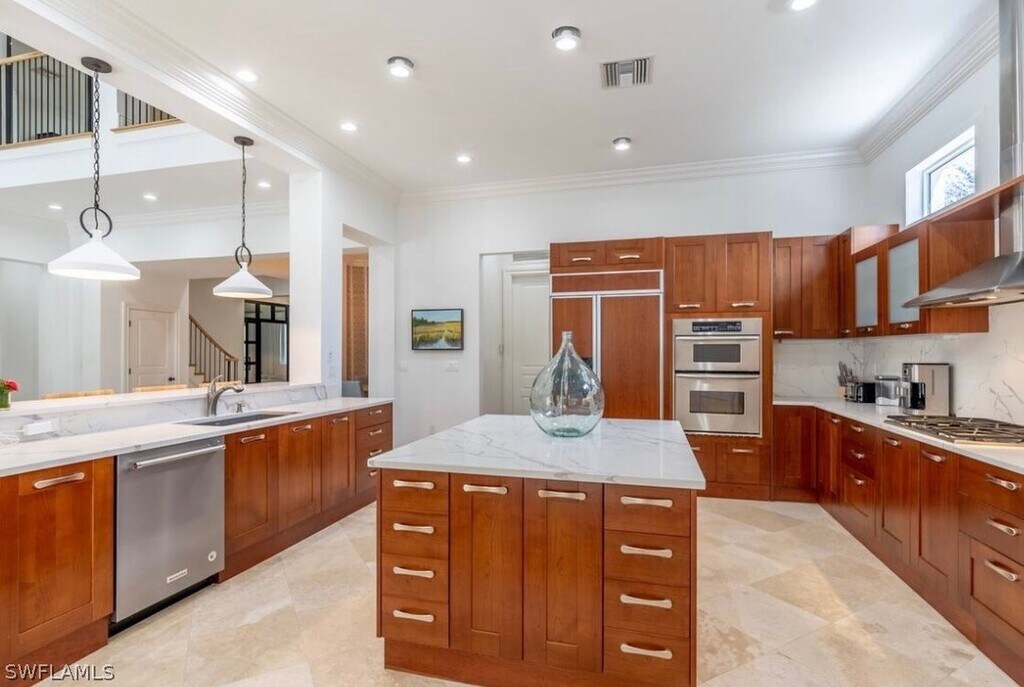 Stunning,recently renovated,and professionally decorated throughout. Five bedroom plus den,five and a half bathrooms,and a grand entry foyer with sweeping stair case. Double-height living room with soaring coffered ceilings. The location is excellent in the much desired Moorings neighborhood,which is just minutes to the beach,Fifth Avenue South and Third Street South restaurants,entertainment,and shopping. The first floor has a spacious,open concept with a den and could be sixth bedroom,a grand open living room/dining room/kitchen area,that leads to the pool,outdoor entertaining area and a private landscaped back yard. The primary suite has a king-sized bed,and large sitting room area overlooking the pool. On the second floor is a large family room,four additional bedroom suites,and three more bathrooms. This home has more than one could ask for,and in the best possible location. Spacious driveway has ample room for your guests to park,and a three car garage. The location of this home is close to the private Moorings resident beach.