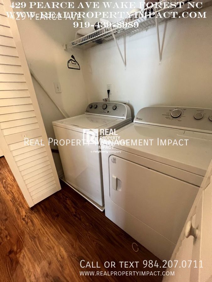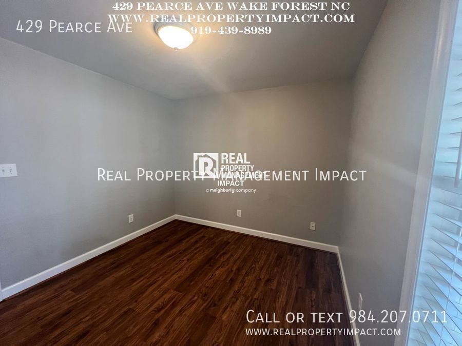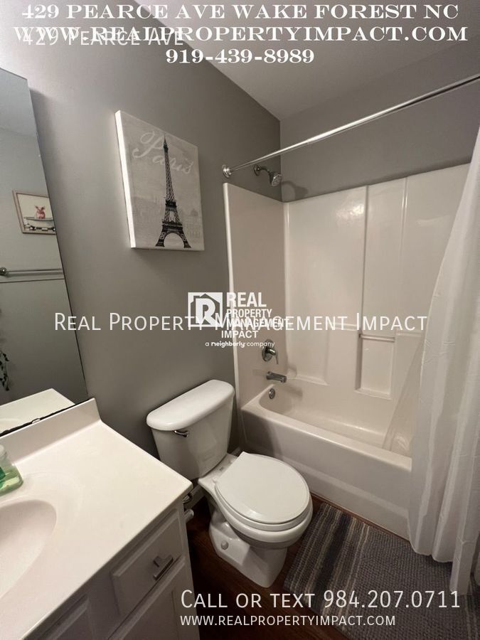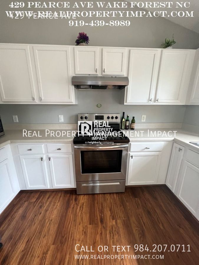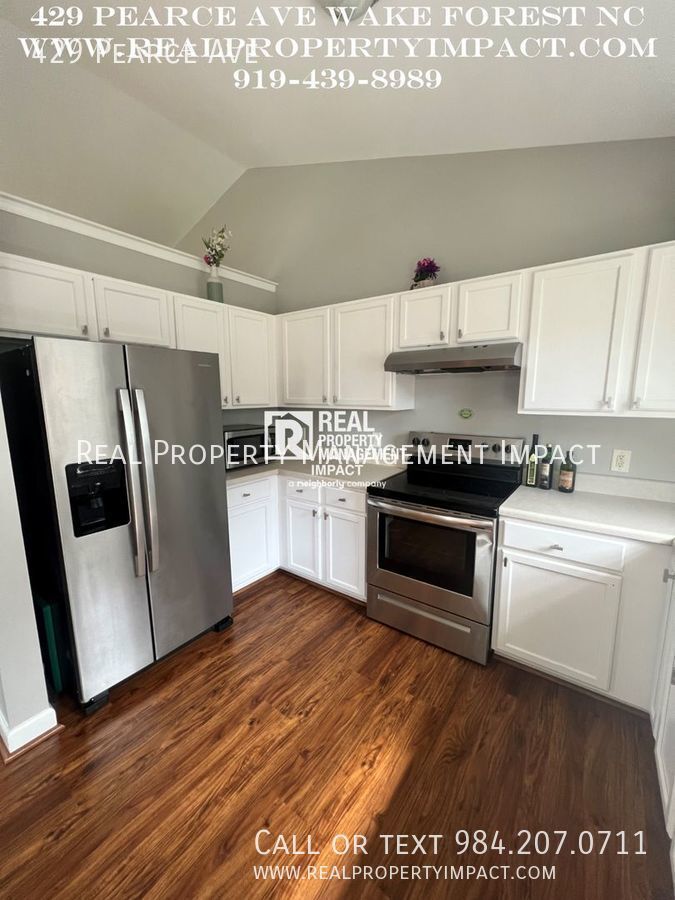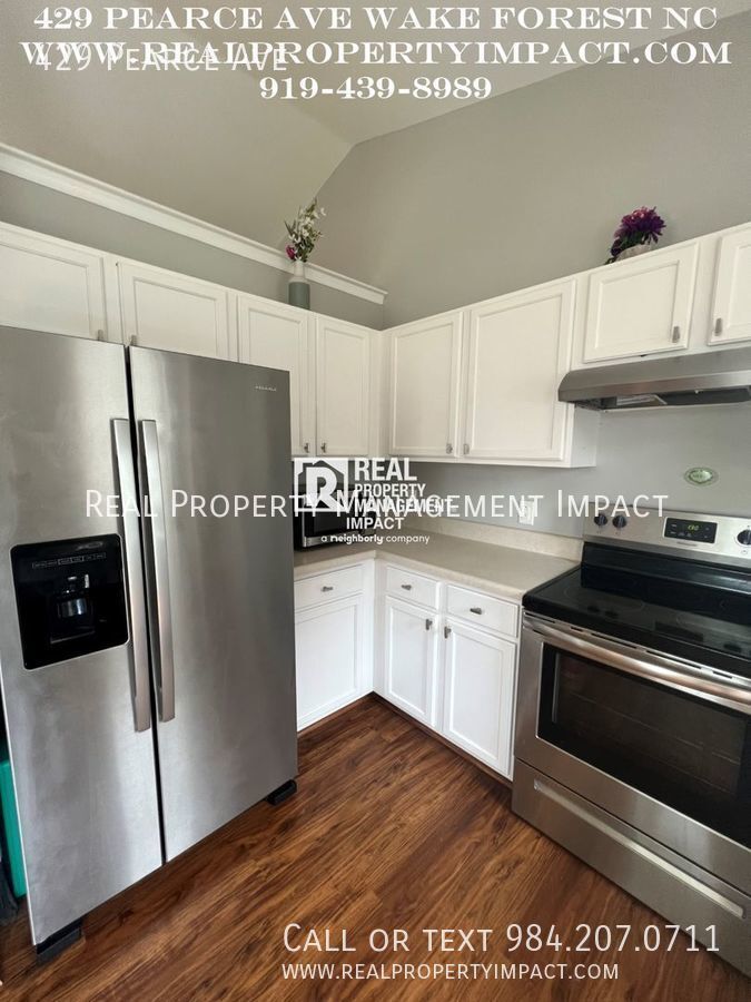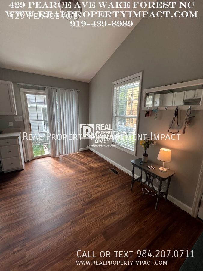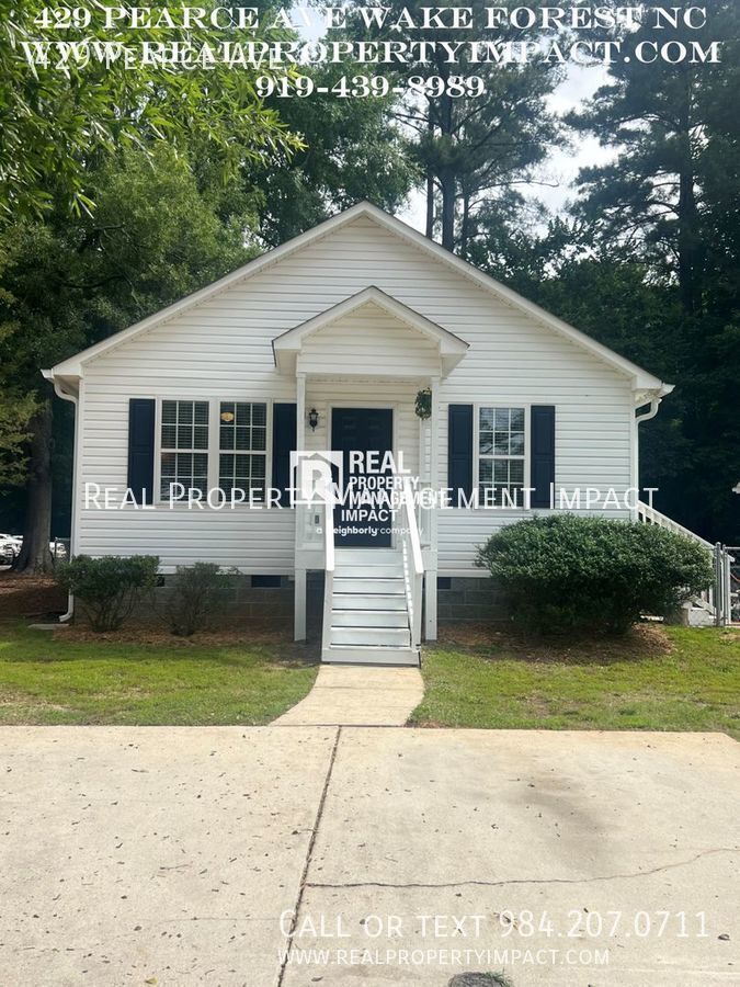 DO NOT MISS THE OPPORTUNTY TO LIVE WALKING DISTANCE TO DOWNTOWN WAKE FOREST. Welcome to this charming, quaint, and crisp white cottage-style home nestled in the heart of Wake Forest. Offering easy one-floor living, this delightful residence is conveniently walkable to the historic Wake Forest area, where you'll find a variety of restaurants, coffee shops, breweries, and even the Seminary. As you step inside, you'll immediately notice the home's inviting atmosphere, filled with an abundance of natural sunlight that bathes the interior. The vaulted ceilings in the living room and kitchen create an open and airy space, perfect for relaxing or entertaining guests. The renovated all-white kitchen is a true highlight, boasting stainless steel appliances, ample counter space, and a bright eat-in dining area. Through the glass doors, you'll have easy access to the deep fenced-in backyard, providing a private retreat for outdoor activities and gatherings. The home features freshly painted walls and updated hardwood-style flooring, enhancing its appeal and providing a clean, modern aesthetic. You'll also find a convenient laundry closet (hook up available washer and dryer not included) ensuring laundry tasks are a breeze. With two full baths, including an en suite in the vaulted primary room, comfort and convenience are prioritized. Additionally, this home offers two cozy rooms, one of which can serve as a home office or a guest room, providing flexibility to accommodate your specific needs. Whether you're starting your homeownership journey or seeking a cozy retreat, this residence is a great starter home. Outside, the yard boasts mature trees, adding a touch of natural beauty and providing shade during warm summer days. Off-street parking is available, ensuring convenience for you and your guests. With its quaint charm, abundant sunlight, and prime location in Wake Forest, this crisp white cottage-style home is a true gem. Experience the joy of one-floor living, walkable amenities, and a peaceful backyard oasis in this delightful residence. Application Criteria • Credit Score – Min 600 (soft pull) • Income (monthly) –3X Monthly Rent • Everyone over 18 must apply ($55 application fee applies to all applicants) • No Evictions • Criminal Background Screened • If pets are allowed – separate pet screening is required. • All information provided on the application is screened and verified. • Approval timeline varies based on the verification process. Average = 48 hours. AVOID RENTAL SCAMS: Real Property Management Impact is a licensed Real Estate Agency that exclusively markets and represents this listing. We do not advertise on Craigslist or Personal FB Pages. We would never ask you to wire money, request funds through a payment app for initial rent, deposits, or take the key after your showing to move-in.