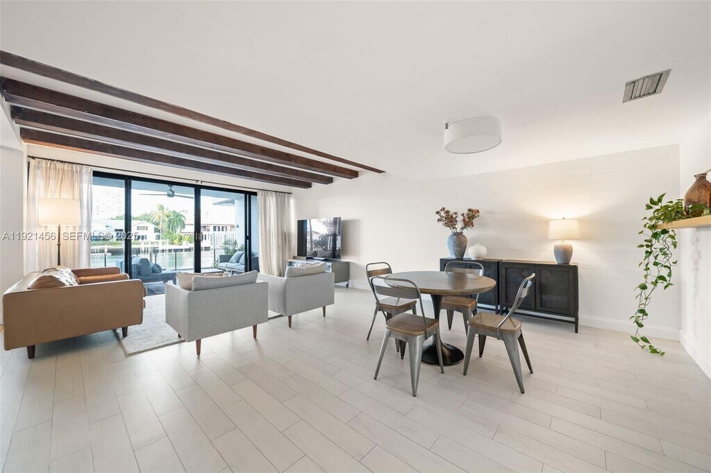 Waterfront living at its finest in Sunny Isles. This spacious 2-story residence is located in the exclusive, guard-gated Poinciana Island—an intimate 13-acre community with lush landscaping, marina views, and direct Intracoastal access. The home offers 2,370 SF of interior space plus an expansive 500+ SF private deck at water level, ideal for entertaining or enjoying peaceful views of Atlantic Isle. Inside, the open layout features soaring exposed-beam ceilings, custom millwork, porcelain floors, and great natural light. The modern kitchen includes sleek cabinetry and stainless-steel appliances. Bedrooms are generous with renovated bathrooms, walk-in closets, updated closet doors, and excellent storage. Additional upgrades include a new washer/dryer, utility sink, and outdoor fans. Poinciana Island offers resort-style amenities: 2 heated pools, 4 tennis courts, basketball, gym, clubhouse, and a scenic boardwalk that wraps the island. Beach access is directly across the street, with Bal Harbour Shops and Aventura Mall just minutes away. A rare opportunity to enjoy space, privacy, and true waterfront living in the heart of Sunny Isles.