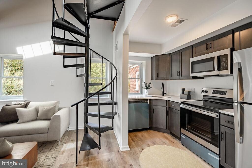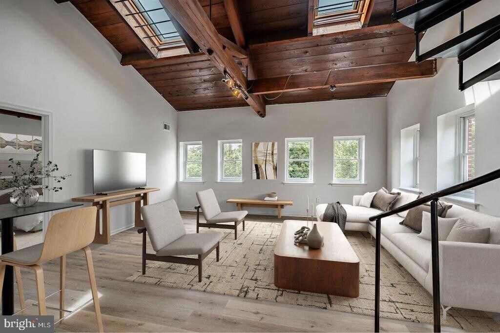 Off-street parking included. Welcome to 430 N West Street, an architecturally stunning one-bedroom loft apartment located in the heart of Wilmington’s Quaker Hill district. This unique residence blends industrial charm with modern finishes, featuring exposed wood beams, high ceilings, and a striking spiral staircase leading to a spacious loft—ideal for a home office, studio, or guest area. The open-concept living and dining room is filled with natural light from multiple windows, showcasing beautiful plank flooring and clean, modern lines throughout. The kitchen includes stainless steel appliances, sleek cabinetry, and ample counter space. The updated bathroom and in-unit washer and dryer add comfort and convenience. Situated in an eleven-unit boutique building, this property offers a perfect balance of character and privacy with walkability to downtown Wilmington’s restaurants, cafes, and shops along Main Street and the Riverfront. Virtually staged for inspiration.