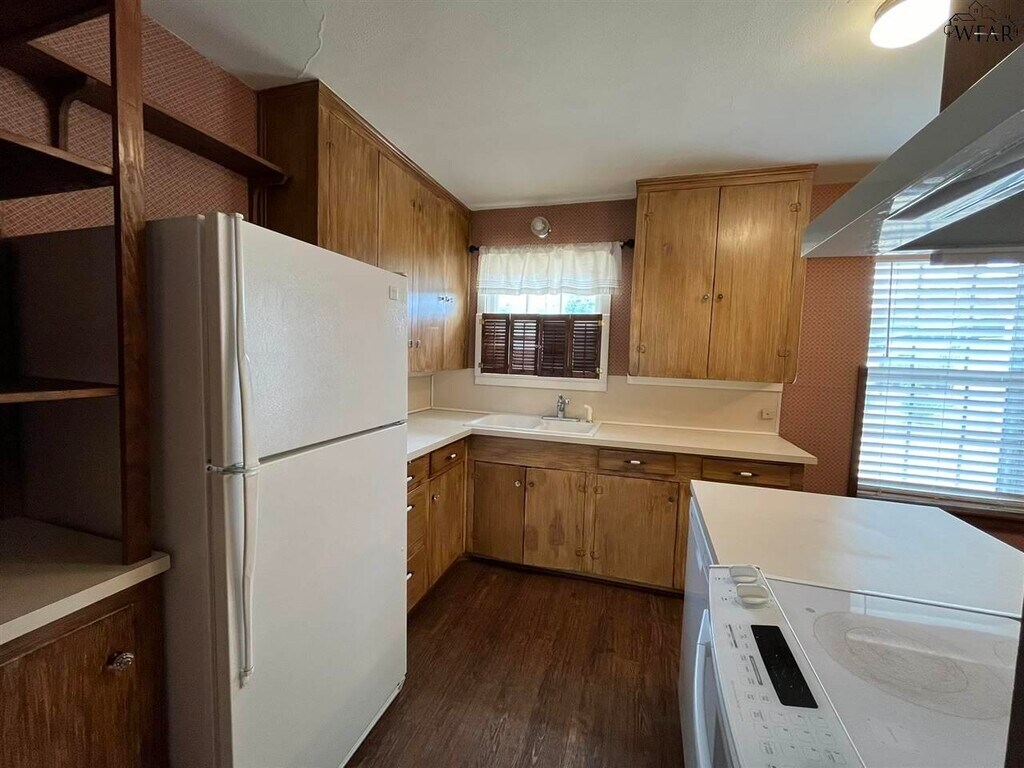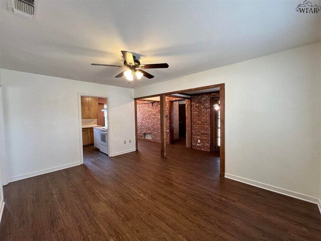 Charming, 2 bedroom, 1 bath, 1-car carport home in a quiet neighborhood. Entry into the home features a brick accent wall and floor-to-ceiling French-style windows. Living room has a ceiling fan. Dining area is open to the kitchen. Kitchen has a refrigerator, dishwasher, electric range/oven. Laundry room offers an abundance of storage including a walk-in pantry. Bedrooms share a hall bath with shower/tub combination and cabinet storage. Hall linen closet. Large backyard with chain fencing.