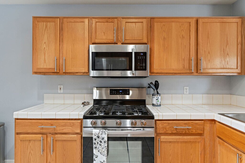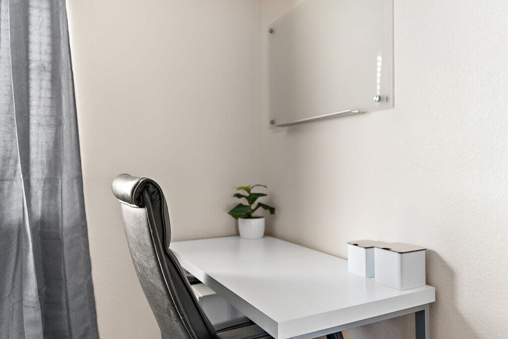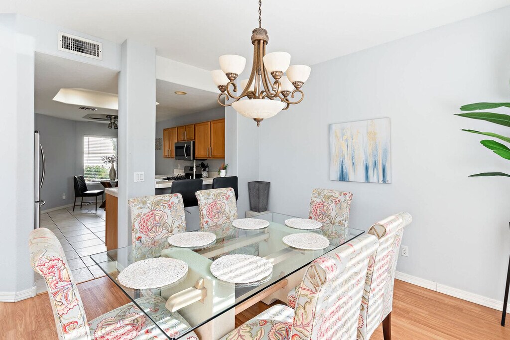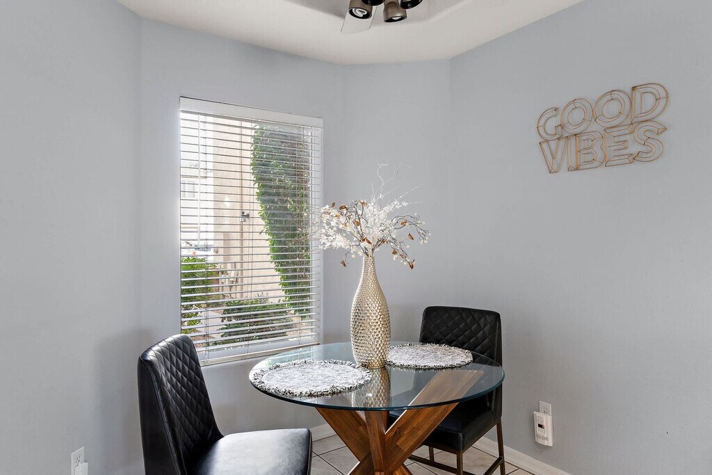 In this gated Biltmore-area townhome, you're just minutes from downtown Phoenix, Sky Harbor, and the city's top shopping and dining destinations. With three bedrooms, 2.5 baths, and ample space to relax both inside and out, this townhome offers a comfortable base for extended stays of 30+ nights. Start your mornings with coffee on the patio, take a dip in the community pool, or work from the dedicated desk before heading out to explore. This townhome features three comfortable bedrooms: one with a king-size bed, another with a queen-size bed, and a third with a twin-over-twin bunk bed. Fresh bedding and towels are provided, along with high-quality bath essentials. The fully equipped kitchen includes appliances, cookware, a coffee maker, toaster, and blender. Enjoy the convenience of an in-home washer and dryer, central A/C and heat, and a patio with seating. The community offers a pool and BBQ area for your enjoyment. Pets are welcome with prior approval. Free driveway parking is available for two cars, although the garage is not accessible. Utilities are included up to $300 per month. Centrally located, you'll be just minutes away from Sky Harbor Airport, Downtown Phoenix, the Central Avenue Corridor, the Biltmore shopping district, Phoenix Children's Hospital, and Arizona Heart Hospital. Explore a thriving array of nearby restaurants, cafés, and entertainment options. With easy access to major freeways, you can conveniently explore the Valley. Quiet hours are between 10 pm and 8 am. No parties or events are allowed, and smoking is prohibited inside the unit, with a $500 minimum cleaning charge for violations. A $100 charge will apply for bringing more than six guests. Please respect check-in and check-out times, as early or late changes without prior approval will incur a fee of $50 per hour. Pool rules are posted outside by the pool, and there is no lifeguard on duty. Exercise extreme caution with children near the pool and designate a 'water watcher' for safety. The townhome includes a dedicated workspace and high-speed Wi-Fi, making it ideal for remote work or streaming. [SI]