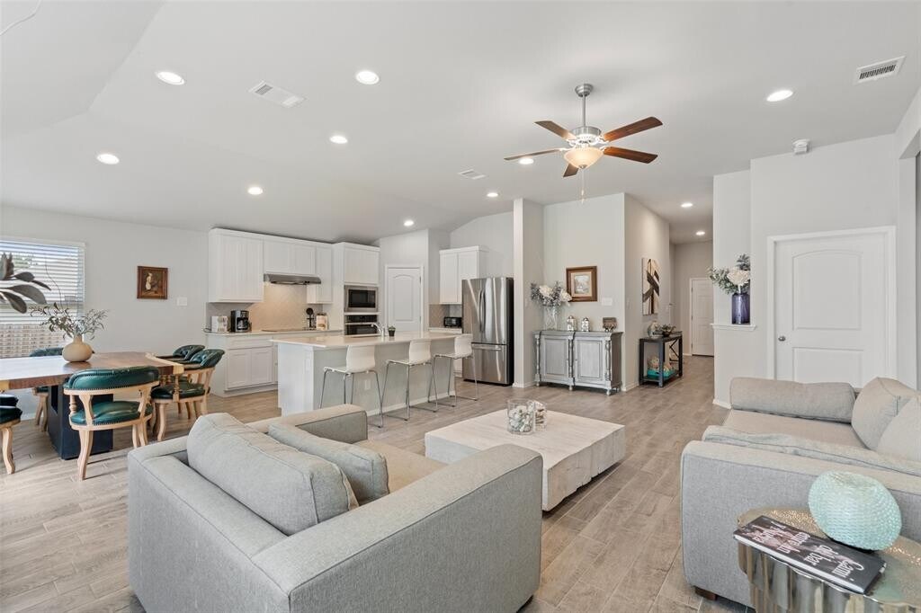 Turnkey fully furnished rental! This open concept 3 bed, 2 bath home features high ceilings, wood-look tile floors in the main living area, and an abundance of natural light. Ideal for entertaining, the bright & cheerful kitchen is the focal point of the main living area, boasting a large center island, quartz countertops, tile backsplash, and stainless steel appliances. An additional bonus room down the hall makes the perfect space for game or movie nights with friends and family or could be used as a home office. The primary suite features a walk-in closet and en suite bath with double vanity, soaking tub, and walk-in shower. Relax under the covered patio or enjoy gardening, barbecuing, or playing with kids/pets in the backyard. Nestled in the scenic suburb of Lago Vista along the north shore of Lake Travis, the community offers access to an abundance of amenities including numerous lakeside parks and a marina, sports courts, a fishing well, a swimming pool, hiking paths, and more. All facilities are available to members of the property owner's association, additional fees to access amenities may apply. See POA documents for details. Contact Agent for unfurnished rental options.