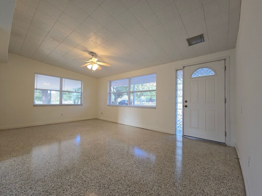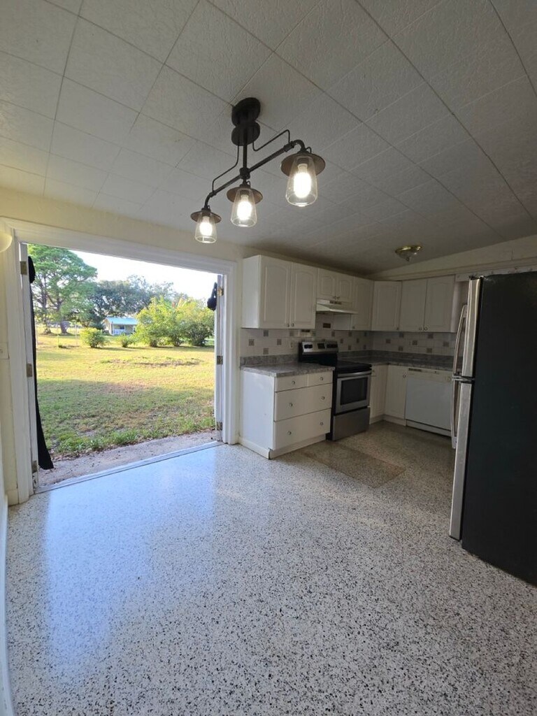Welcome to your peaceful country retreat! This spacious 3-bedroom, 1-bathroom home is filled with character and natural light. As you enter, you'll love the spacious living room featuring large windows and beautiful, easy-to-maintain terrazzo flooring that runs throughout the home. The layout flows perfectly from the living room to a separate dining area and into the full-size kitchen, which comes equipped with a full-size refrigerator. From the dining area, elegant French doors open onto a large, beautiful, and open backyard, creating a seamless indoor-outdoor living experience. The home also boasts an equally impressive large front yard, shaded by mature oak trees, offering wonderful curb appeal and a serene setting on a quiet country road. All three bedrooms are well-sized, sharing a full bathroom complete with a full-size bathtub. Comfort is guaranteed with central air conditioning and a ceiling fans. This home also includes washer/dryer hookups and a covered driveway/carport to protect your vehicle. Don't miss this opportunity for quiet, spacious living. Contact us today to schedule a tour!