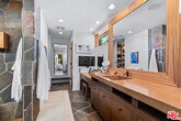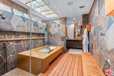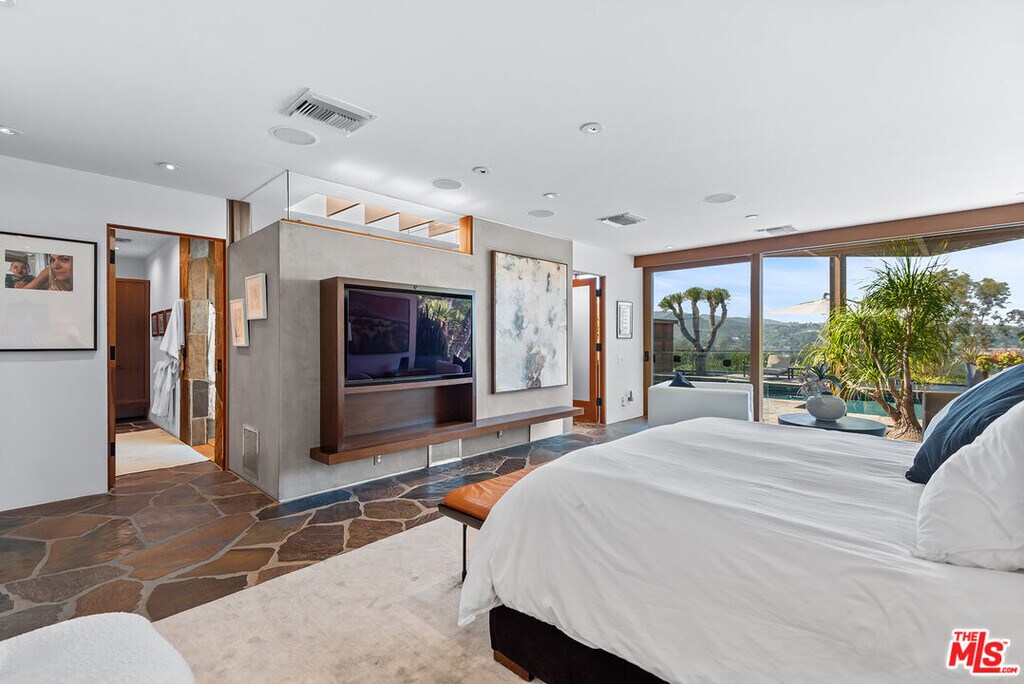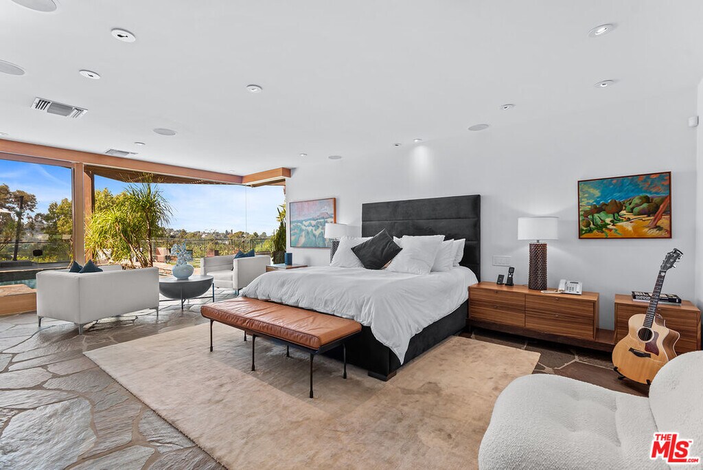 Tucked behind a sculptural concrete wall in Encino's coveted Royal Oaks enclave, this striking residence is a masterwork of California Mid-Century Modern design reimagined with organic and contemporary influences. A private courtyard with a burbling fountain sets a tranquil tone, while open living spaces showcase exquisite craftsmanship, natural textures, and refined simplicity. The living room's soaring exposed-wood vaulted ceiling crowns a wall of glass that highlights the home's effortless indoor-outdoor flow. The primary suite serves as a serene, Zen-inspired retreat, while its spa-like bath is a study in natural luxury featuring warm wood accents, hand-set stone walls, a skylit rain shower, and a deep soaking tub. Beyond, an architectural landscape of flagstone terraces, olive trees, and sculptural plantings unfolds to reveal sweeping canyon views. The expansive Ipe deck offers built-in seating, an outdoor kitchen, and seamless flow to a stunning stone-framed pool with an adjacent cold plunge. A glass-enclosed sauna with panoramic views and a secret treehouse nestled among mature trees complete the property's resort-like atmosphere an inspired fusion of design, nature, and quintessential California modern living. MLS# 25615597