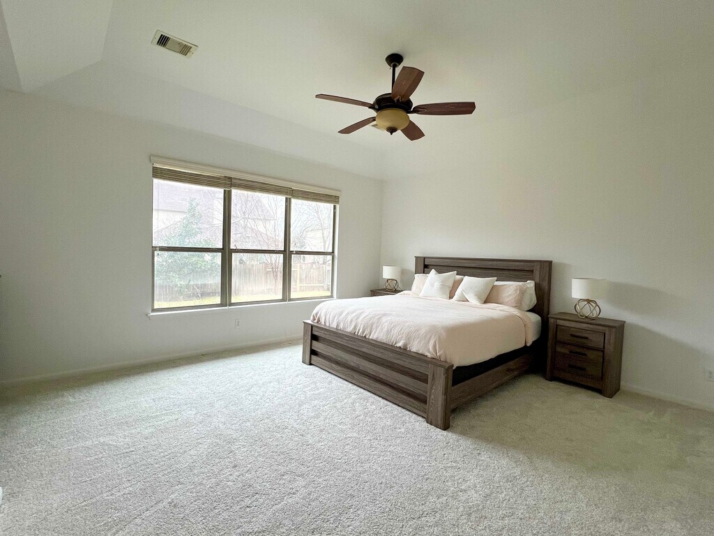 Set on a quiet cul-de-sac in Sendero Springs, this stunning home offers a functional layout with smart upgrades and tons of natural light. The main level features wood-look luxury vinyl plank flooring, an elegant foyer, formal dining room, and a living area with fireplace. Off the entry, a dedicated office works well for remote work or flex space. The kitchen includes granite countertops, a center island, gas cooktop, built-in oven and microwave, stainless steel appliances, and generous pantry cabinets, plus an adjacent breakfast area. The main-floor owner's suite overlooks the backyard and features a walk-in closet, double vanity, soaking tub, and separate shower. In the laundry room a smart front load washer and dryer are included. Upstairs, soft, luxurious carpet runs through a spacious loft or game room and two large secondary bedrooms. A renovated full bath with double vanity serves the second floor. Smart home features include an intelligent lighting system for customizable ambiance and a smart HVAC system for energy-efficient climate control. Additional upgrades include solar panels, a water softener, and a climate-controlled garage with mini-split and an elliptical, ideal for a home gym setup. Outside, a huge private fenced backyard offers a covered porch, outdoor fireplace, and both gas and smoker grills. Lawn care is included. Community amenities include a pool, basketball court, playground, picnic tables, and BBQ grills, with convenient access to major roads, shopping, and dining.