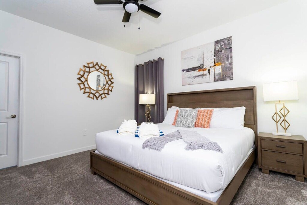 Discover the ultimate Orlando retreat in this 5-bedroom Storey Lake home, nestled in a prime resort near Disney parks. With unparalleled amenities, including a lazy river and fitness center, this comfortable haven accommodates 13 guests with 5 bedrooms and 5 bathrooms. Enjoy a private pool, ample space, and themed bedrooms for the kids, making it the perfect family getaway. Welcome to this inviting 5-bedroom home, thoughtfully designed to offer your family ultimate comfort. The seamless flow from the living room to the dining area and fully equipped kitchen creates a central hub for relaxation and culinary delights. Step outside to the serene patio, featuring a private heatable pool for your family's enjoyment. The first floor boasts a queen bedroom with its private bathroom, providing convenience and comfort, and another king bedroom suite ensures a restful stay. Ascending to the second floor, you'll find a family room, creating a cozy gathering space. The master king bed suite promises luxury, while the Mickey-inspired bedroom features a playful bunk bed with two single beds and an additional single bed. The fifth bedroom, inspired by the 'It's a Small World' attraction, offers a bunk bed with two singles and a full bed, catering perfectly to families. For added convenience, a laundry closet with washer and dryer is available. Enjoy seamless connectivity with free Wi-Fi and the convenience of free parking. A thoughtful welcome kit with essential bathroom and kitchen amenities is provided to start your stay smoothly. Heating the pool is a paid service and there is also a fee charged to use the barbecue grill. The Storey Lake Resort offers it all, situated around a scenic lake with a variety of water amenities and activities. Hideaway Club tropical resort-themed features a large pool with lazy river, two waterslides, and children's splash pad. Relax in the spa or sunbathe on the terrace and sand beach areas. Fishing, canoe and kayak rentals are available at the community dock. Enjoy a cold beverage or ice cream at the resort’s poolside café. Don’t forget to get in a game of mini-golf, volleyball, or basketball. Escape the sun at the covered tiki bar or venture inside the resort’s clubhouse, which includes a guest lounge area, fitness center, and business center. Quiet hours are between 22:00 and 8:00. Replenishment of bathroom and kitchen amenities is the guest's responsibility. [SI]