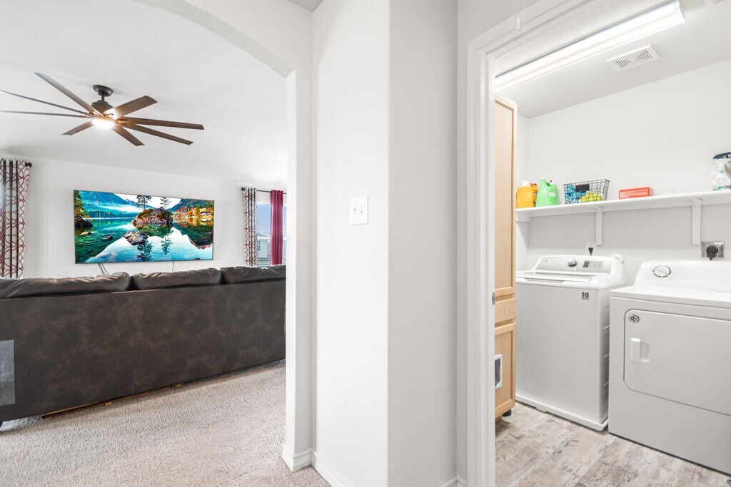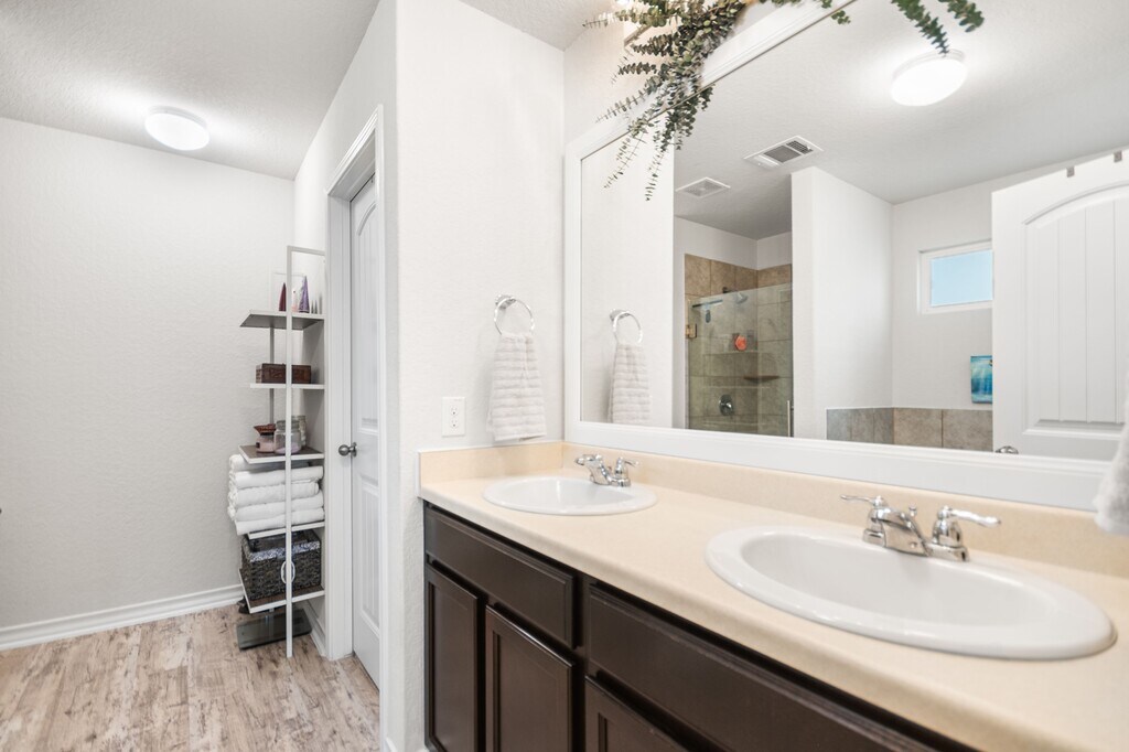 Ideally located in Schertz-Cibolo-Universal City ISD with quick access to JBSA-Randolph, Fort Sam, downtown Cibolo, Crescent Bend Nature Park, I-35, and Loop 1604. This well-maintained 2-story home features an open-concept layout with wood-look vinyl flooring in the main living areas. The kitchen offers granite countertops, a large island with breakfast bar, stainless steel appliances, ample cabinetry, and a walk-in pantry. Upstairs includes all bedrooms, a game room, and a conveniently located laundry room. The primary suite features separate tub and shower, double vanities, and a large walk-in closet. Secondary bedrooms include built-in shelving for added storage. Corner lot with added privacy, fully fenced backyard, covered front and rear patios, two-car garage, sprinkler system, and water softener.