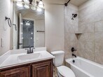 For lease: Beautiful 4-bedroom, 3-bathroom home featuring 1.5 stories with a loft, one bedroom, and full bath upstairs. The primary suite and two additional bedrooms are on the main level. The primary bedroom offers an ensuite with dual sinks, a soaking tub, and a walk-in closet. The open-concept kitchen includes an island, stainless steel appliances, a pantry, and ample cabinets, flowing into the dining and living areas. Enjoy outdoor living with a covered front porch and back patio. The backyard is fully fenced for privacy. Interior highlights include laminate flooring in the main areas, tile in the bathrooms, and carpet in the bedrooms. Perfect for comfortable living and entertaining.