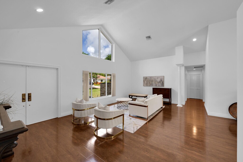 Spacious single-story 4BD/3BA gorgeous pool home in Woodfield Hunt Club,West Boca. 3,069 SF under air on a private .44-acre lot with circular driveway. Vaulted ceilings,hardwood floors,and abundant natural light in the formal living and dining areas. Large kitchen with granite counters,center island cooktop,and double wall ovens. Family room features a wood-paneled cathedral ceiling and floor-to-ceiling stone fireplace. Resort-style backyard with oversized covered patio,ceiling fans,outdoor TV,grill,pool,and spa - all surrounded by mature tropical landscaping and privacy hedging. Two-car garage with an EV charger. A-rated Boca schools. Minutes to Town Center,Whole Foods,I-95,and the Turnpike. Call to schedule a private showing! MLS ID B26012830