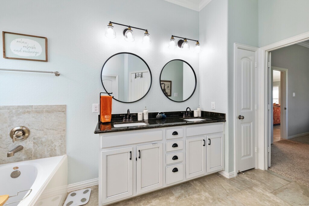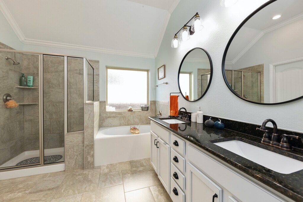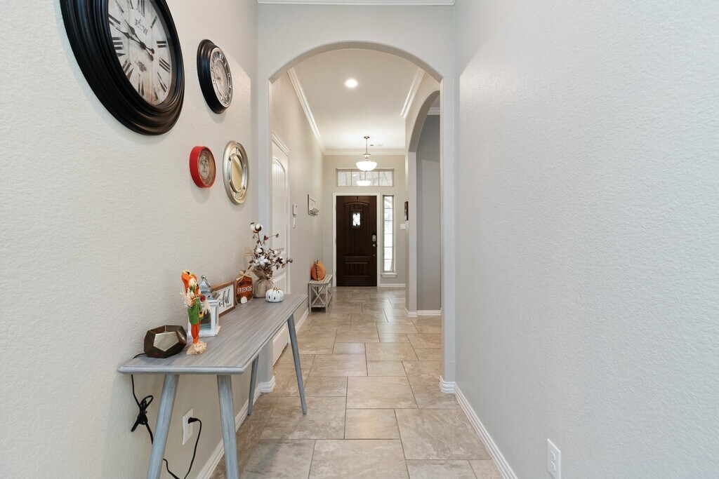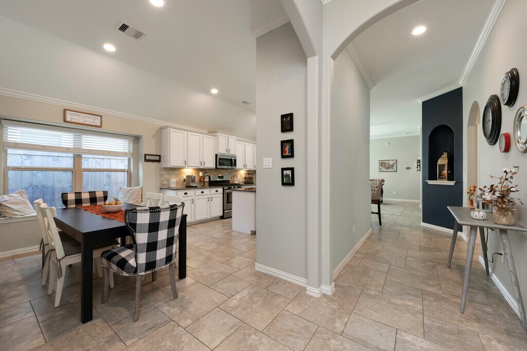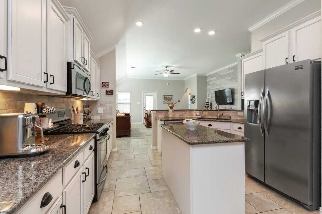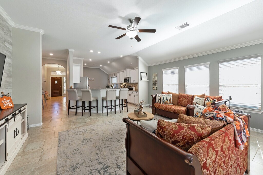 Light-filled entry welcomes you into a private study with French doors,perfect for a home office. Open-concept kitchen features white cabinetry with black hardware,granite countertops,under-cabinet lighting,breakfast bar,and breakfast area overlooking the living room. Tile flooring in a pinwheel pattern flows through main living areas,with carpet in bedrooms. Crown molding throughout and a custom accent wall add style and character. Recent updates include black bathroom and door hardware,new light fixtures,and oil-rubbed bronze mirrors in the primary bath. Ceiling fans in all rooms. Home includes smart switches,whole-home surge protector,water softener,and reverse osmosis filtration. Covered patio with gas line ready for outdoor kitchen,full gutters,and sprinkler system complete this well-maintained home. MLS# 28162825