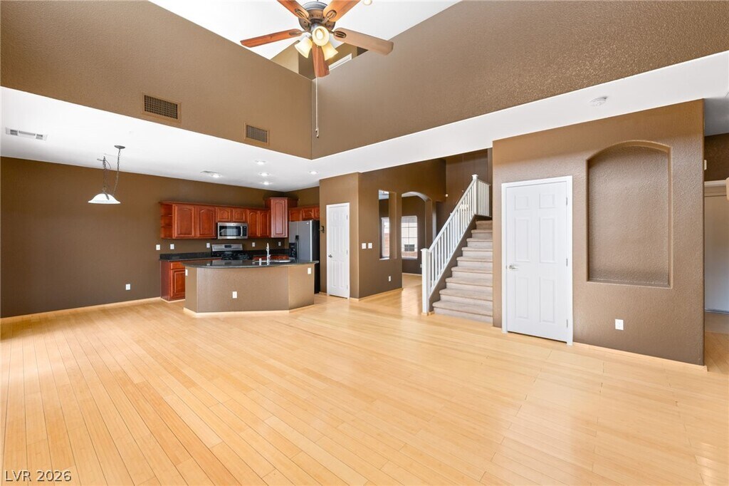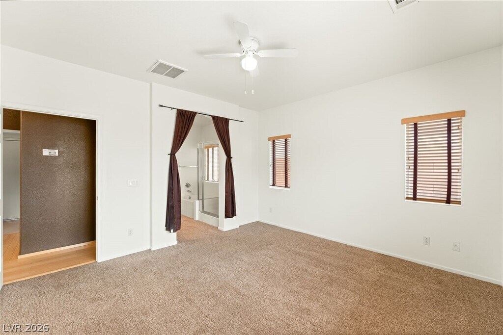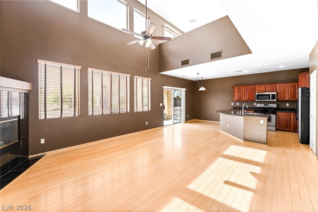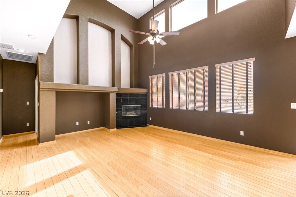 This lovely home offers stunning views of the strip from the upstairs balcony. Two story three bedroom one primary upstairs and one primary downstairs, third bedroom upstairs. First floor includes a den/office. Loft or family room upstairs. The kitchen boasts a center island with stainless steel appliances. Additionally, there is a spacious laundry room with sink and cabinets. The property also includes a three-car garage along with a huge backyard.