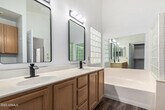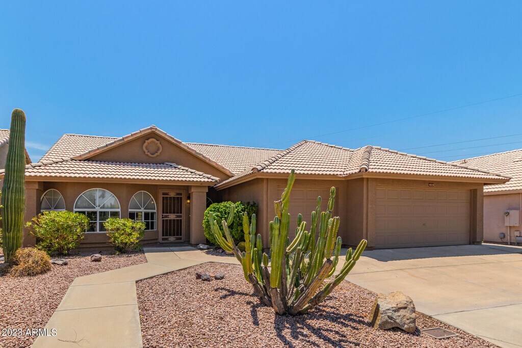 Step inside to a bright,open floorplan defined by soaring vaulted ceilings and elegant finishes. The living area centers around a cozy fireplace,and abundant pot‑shelves add architectural character. The gourmet‑style kitchen boasts stainless appliances,a center island,and a sunny breakfast nook with a bay window - ideal for casual dining or morning coffee. Relax or entertain in the south‑facing backyard oasis,where lush landscaping backs to a natural wash for added privacy and serenity. The yard is desert‑scaped front and back,low‑maintenance and perfectly suited for Arizona living. Three‑car garage provides ample space,and the home also includes newer vinyl/wood‑plank flooring,updated hardware and light fixtures - just move in and enjoy.